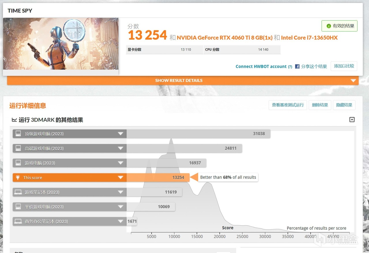 3DMark的Time Spy测试主要测试的是显卡在2K分辨率下的DX12游戏性能,雷神黑武士·猎刃的4060Ti得分13110,综合得分13254,好于68%的测试机器。