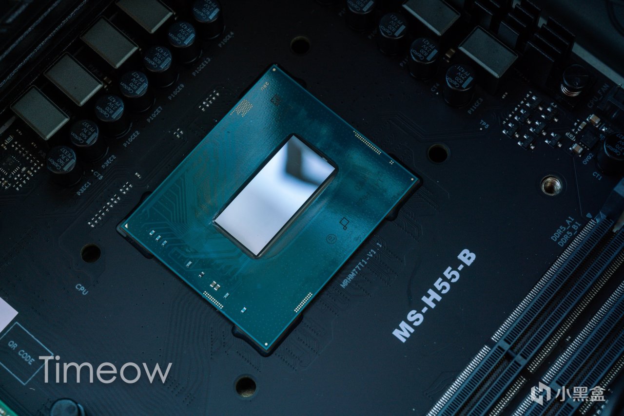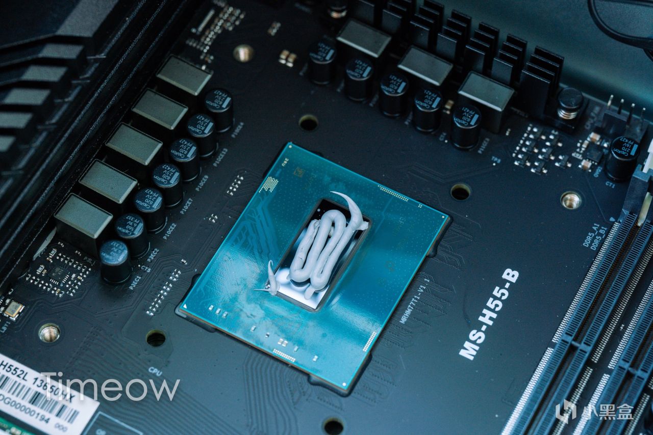小心翼翼的拆下散热器(防止CPU核心被压坏,CPU的die是裸着的,没有金属盖板)后,可见主板全貌,主板是定制的ITX主板,6+1+1的供电和散热装甲,其实有点小豪华。