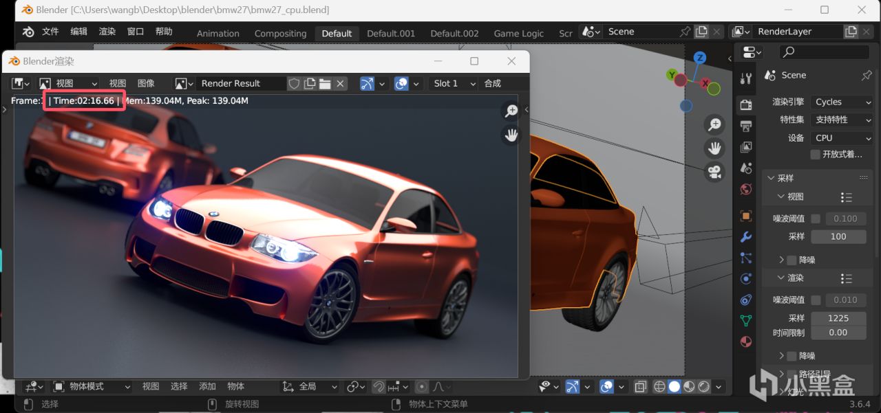 在软件内,我用官网提供的Car Demo用纯CPU渲染,耗时2分16秒(时间越短越好)。