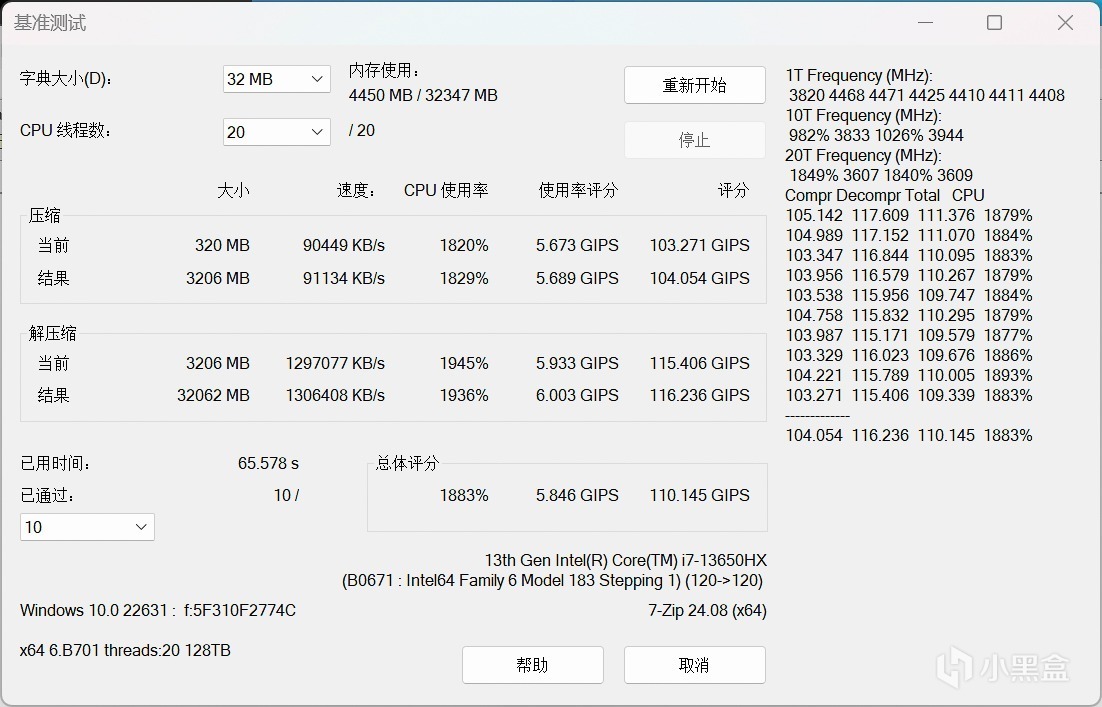7-ZIP解压缩软件自带了PC基准测试功能,它可以反映出电脑日常的办公运行效率,对CPU和内存的性能以及整机的稳定性非常敏感,测试数据供参考: