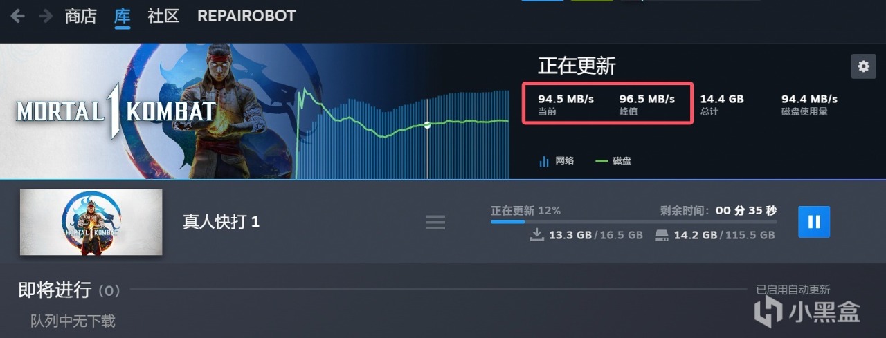 在steam里下载游戏,速度能达到94MB/s以上,基本跑满了家里的宽带速率。
