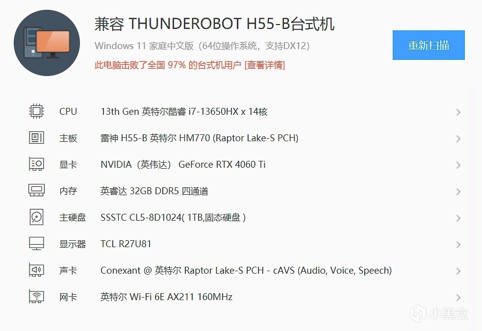 虽然不是电竞级丝滑,但可以享受到高精细度的游戏世界、也能感受到3A级的流畅。雷神黑武士·猎刃的性能可以啊!