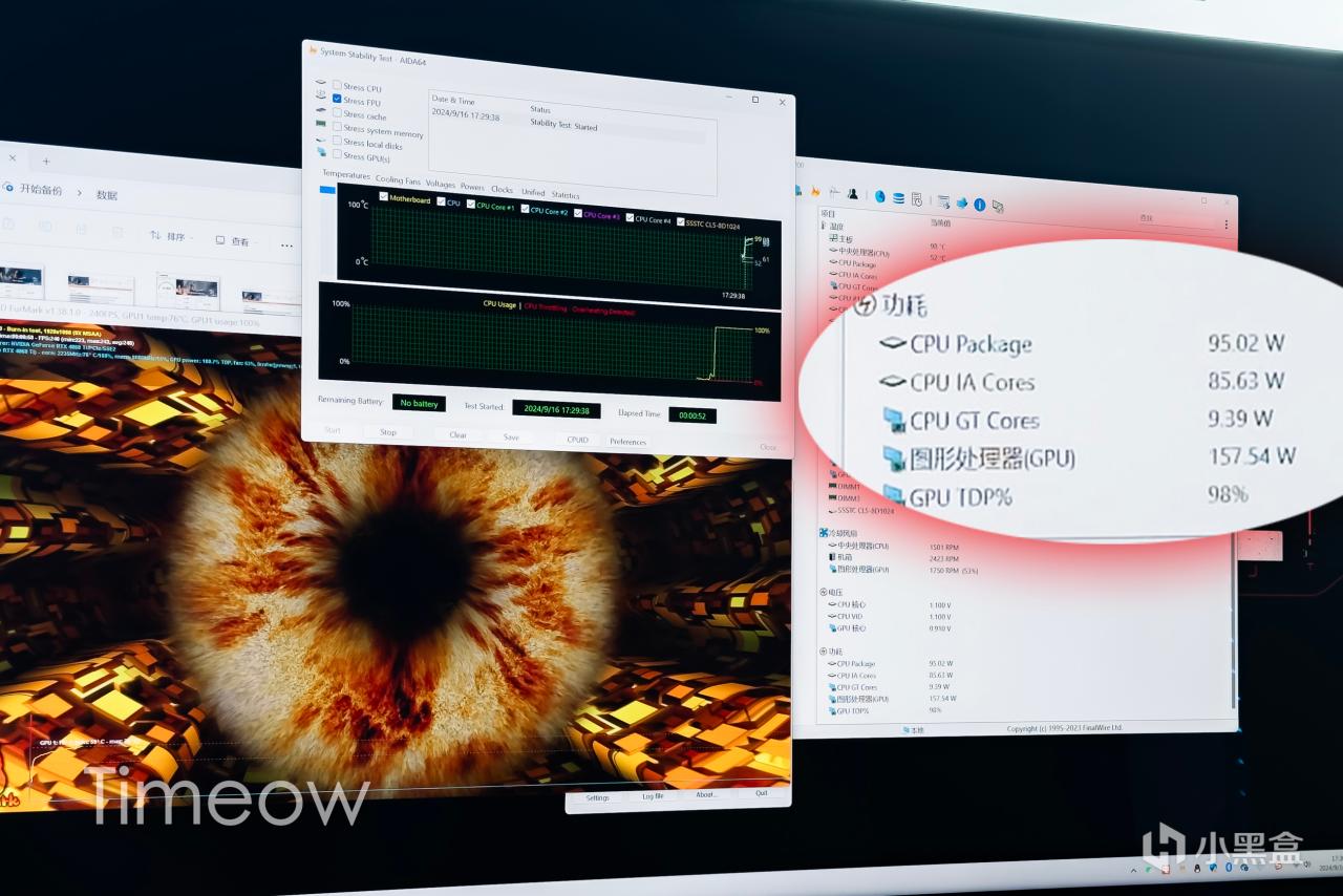 整机我用了CPU和GPU双烤(AIDA64和甜甜圈),来看它的性能释放,CPU功耗95瓦(BIOS限制)、GPU功耗157W,这就是台式机的魅力啊!CPU和GPU不会抢功耗。