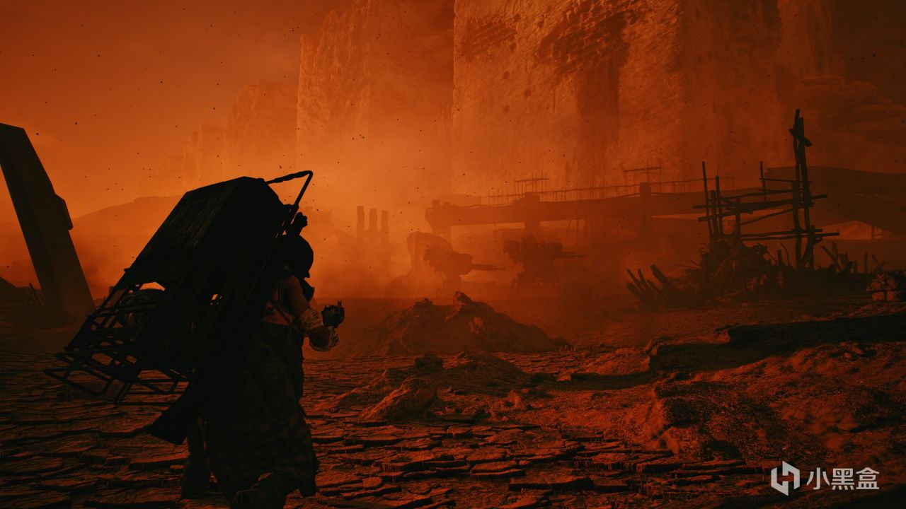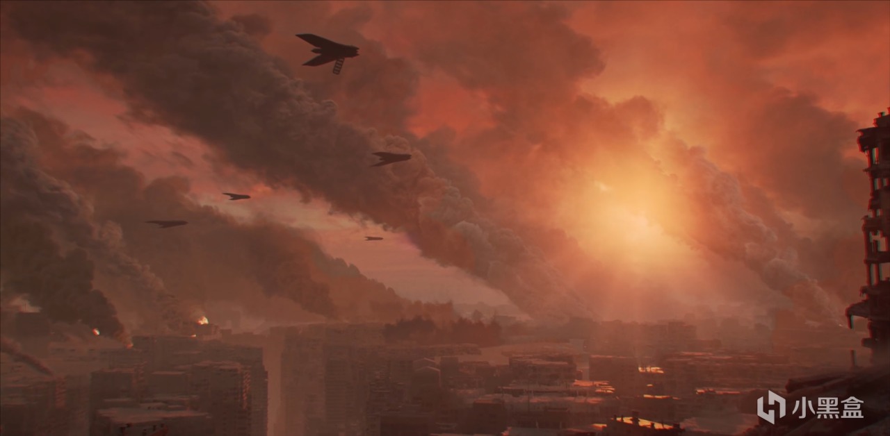 落日黃昏、風蝕巨廈,無人機射出光束搜尋敵人,機甲踐踏龜裂的大地濺起茫茫煙塵,深夜被槍焰照亮,雲層遮掩的天光露出一抹金黃,遠方是燃燒的大地與哨戒炮。