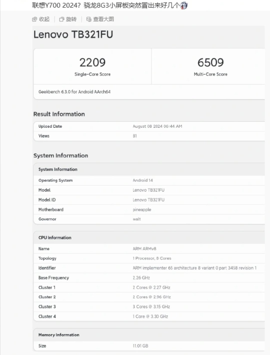 新一代Y700搭載了高通驍龍8 Gen3處理器,這款處理器在GeekBench的測試中表現出色,單核得分2209,多核得分6509,這意味着它能夠輕鬆應對各種高性能需求,無論是日常使用還是遊戲娛樂。