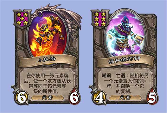 而元素种族方面,除了小拉格下调为五星随从,以及炎魔副官加尔加师傅回归之外,六星的灯神也进行了小小的加强,亡语效改动后变成了先将随机元素牌置入手牌中,然后再召唤其复制体,这样改的好处就是金灯神或者有瑞文的情况下,即使场上格子满了没办法召唤更多随从了,也最起码能获得元素牌,算是小小的强化。
