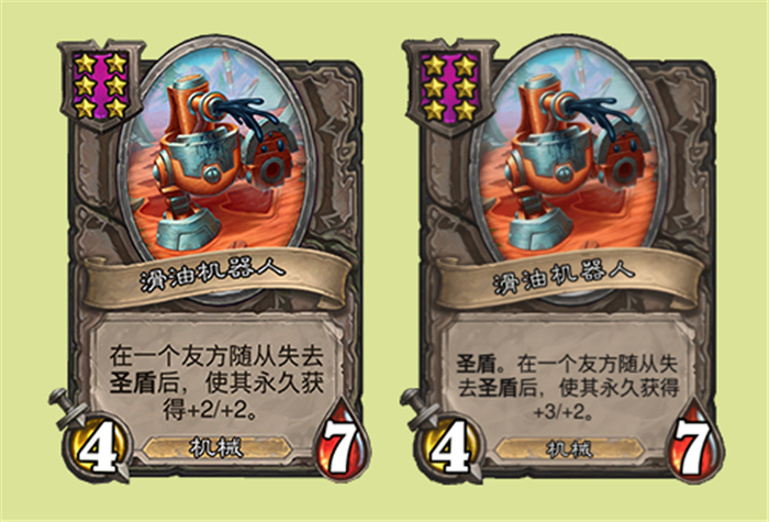 另外之前偷跑的滑油机器人改动也有所谬误,偷跑信息只说了自身没有了圣盾属性,但正式公布的版本,除了本身没有圣盾之外,Buff效率也从+3/+2削弱成了+2/+2,这样即使是在乔治的手里,滑油机器人也没办法发挥出巅峰时期的强度了。