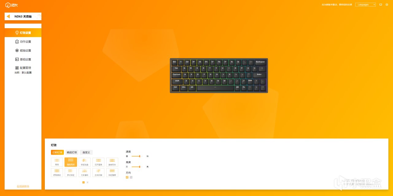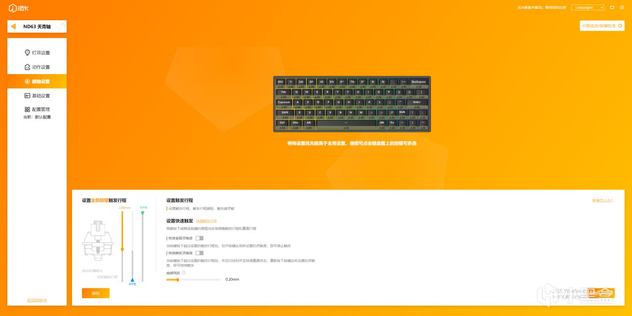 键盘支持一站式Hub驱动+网页驱动,可以在网页中直接修改,非常方便。在驱动中,可以先进行按键校准,然后可以更改灯效设置、动作设置、磁轴设置、基础设置