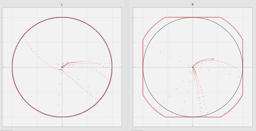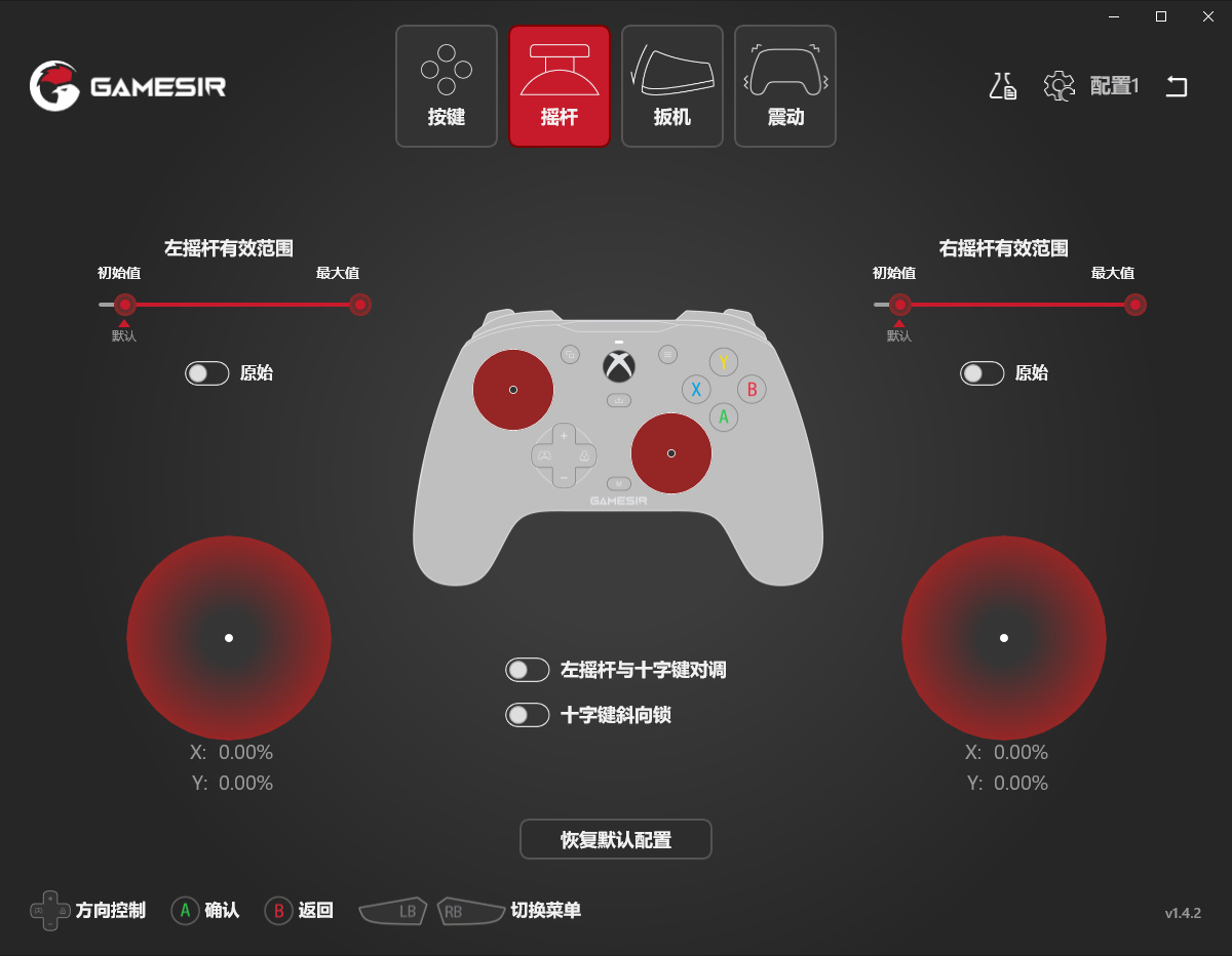 在官方驅動中還能自由切換手柄的搖桿外圈方案,如圖所示,我把左搖桿設置爲圓形的調教方案,能看到他是非常正圓的形態。右搖桿我設置成方形的外圈調教,能看到他的調教方式是八邊形,這是一種精確度非常高,適合FPS手柄操作的調教方案。