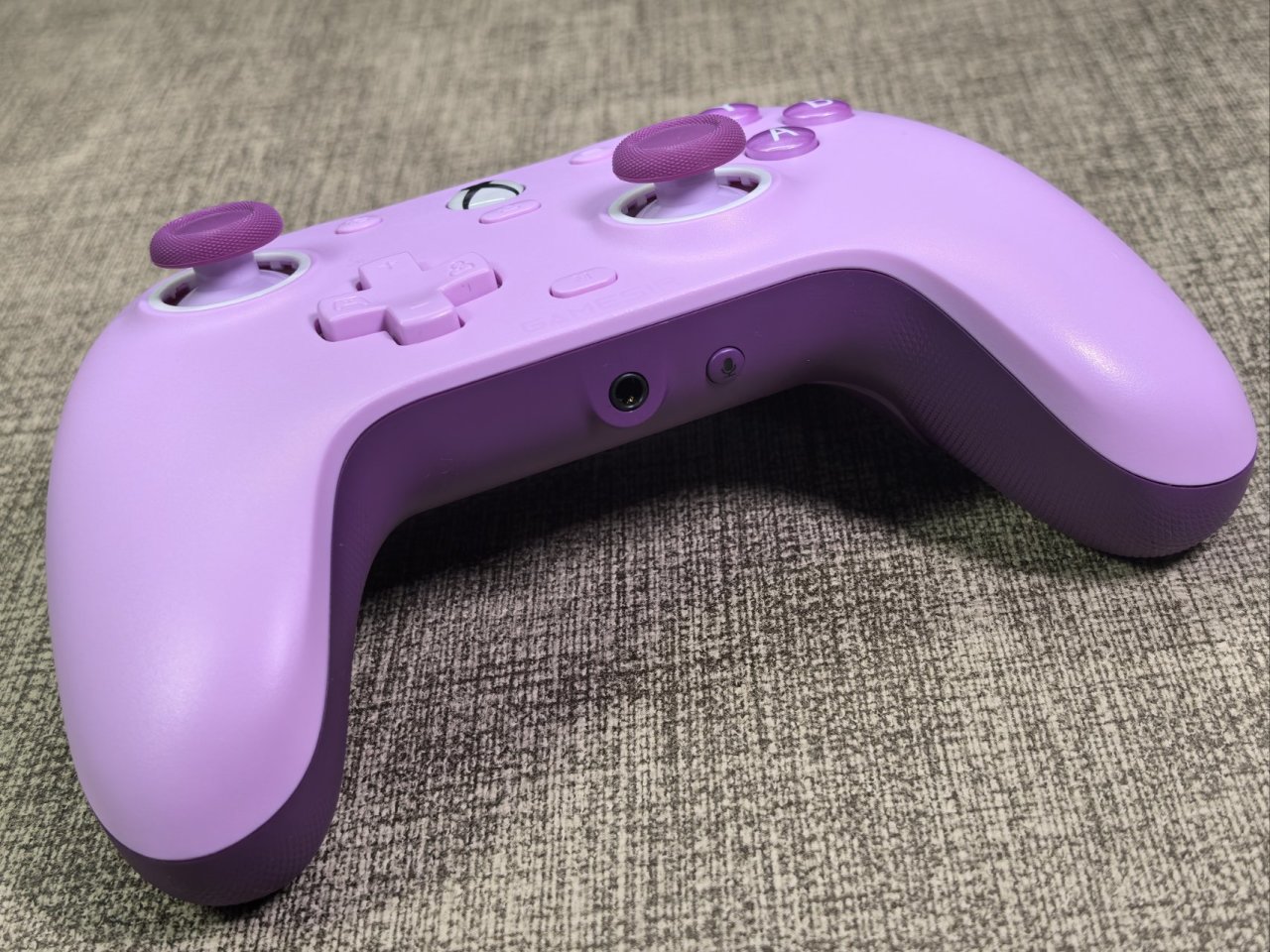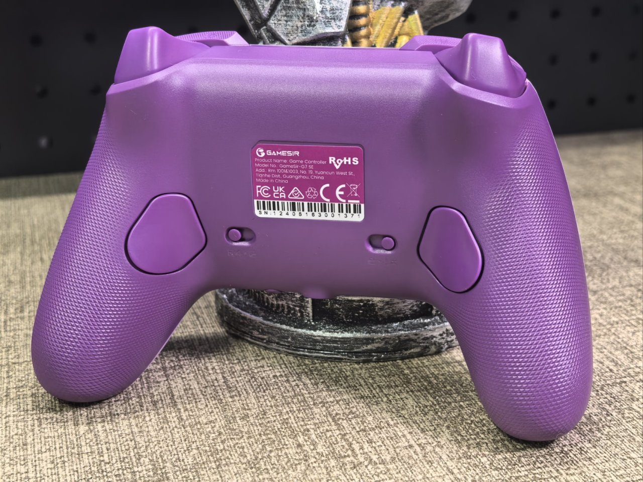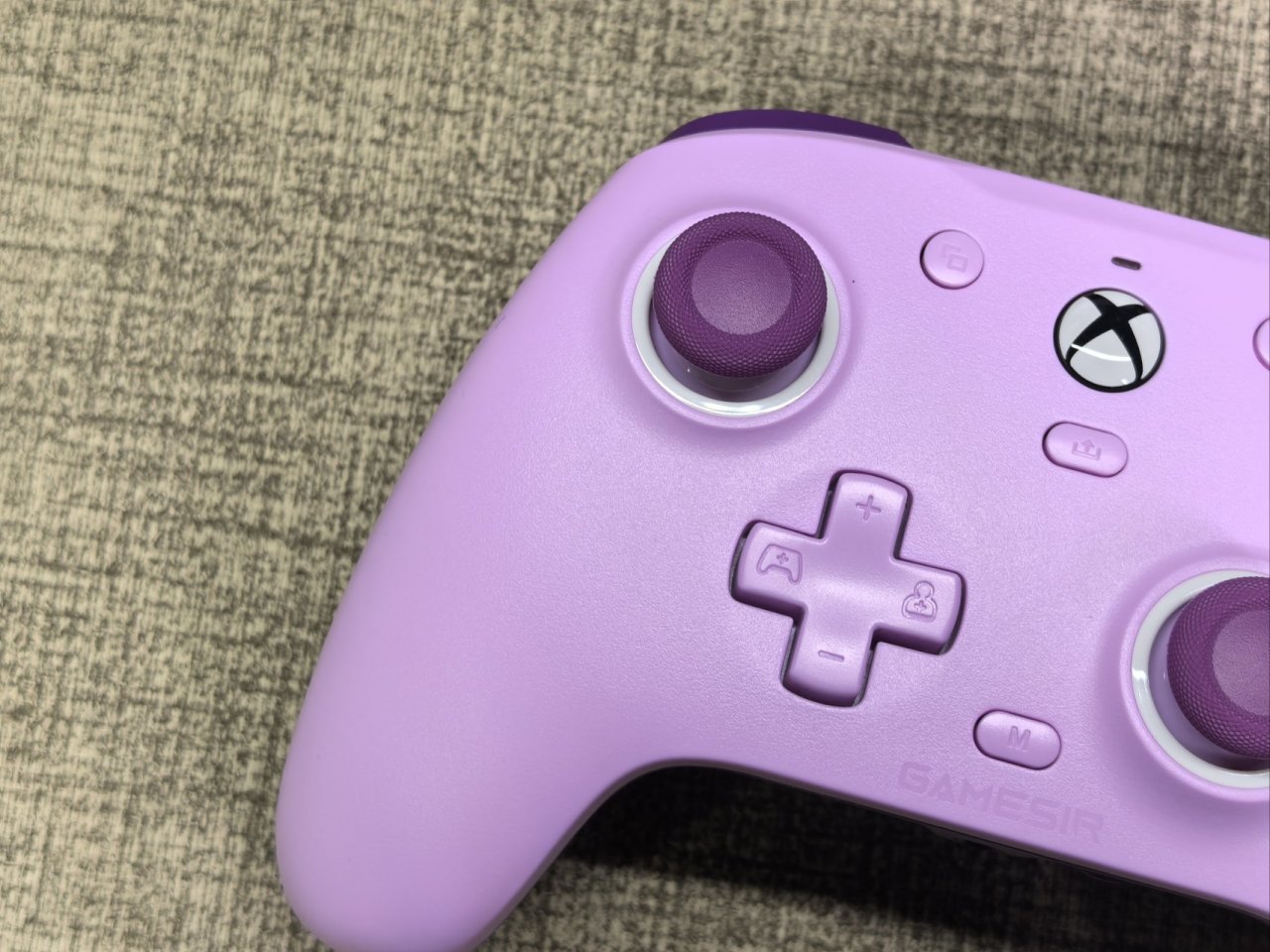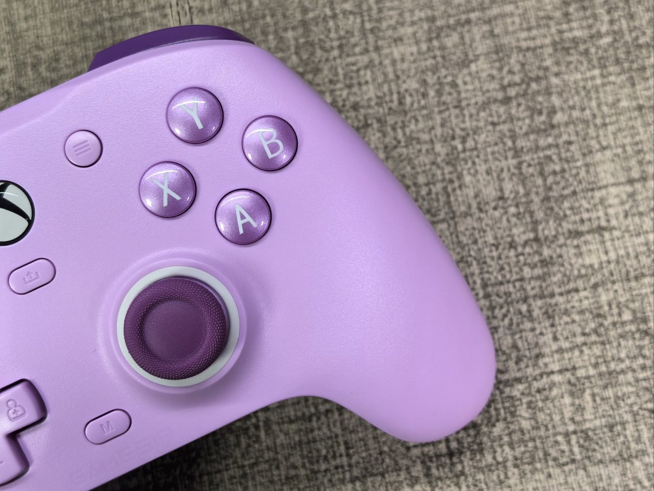 這次的G7 SE多彩版一共推出了三個配色,分別是紫色,橙色及藍色。個人收到的版本爲紫色版本,顏色相對比較鮮豔,它的面蓋爲淺紫色的磁吸面蓋設計,搭配上蓋世小雞推出的磁吸面殼,能夠滿足你的不同喜好。手柄的搖桿、扳機及背面均爲深紫色的配色,插色的設計給手柄帶來了更加高級的感覺。而他的動作鍵也非常獨特,採用珠光配色的動作鍵,在燈光的照耀下會有金屬質感的反光,顯得非常高級。