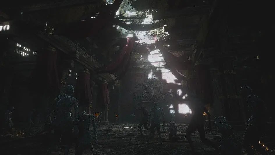 蠟燭、腐朽的佛像爲這片陸地增添一份肅穆神聖的氣息,但一路走過,石化後伸出手臂的人們又爲故事增添一份死寂。他們如傾巢而出的螞蟻企圖逃走,卻最終匍匐在屋檐角,在這塊陸地上化成失去時間的雕像,面向遠處枯萎的巨大花朵留下隻言片語或沉默。