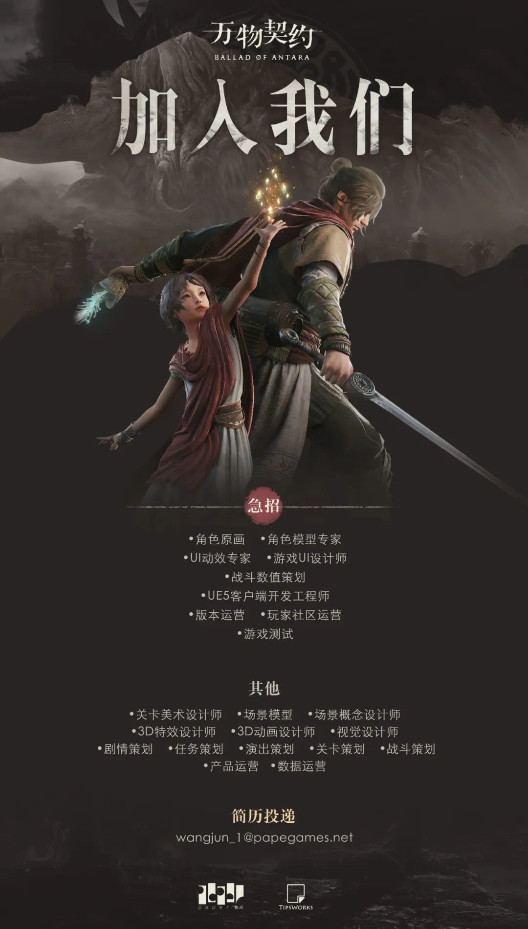《萬物契約》對於疊紙和Tipsworks無疑都是一個新挑戰。據採訪內容,“目前遊戲的完成度已經很高,內容也不少,但基於遊戲該有的體量,需要投入的人力是我們傳統單機遊戲開發的數倍”。而根據《萬物契約》的招聘公告,仍有包含原畫、UI設計、戰鬥數值策劃等多個職位處於急招中。