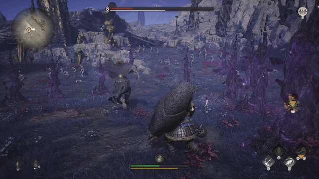 而更巧妙的是,這些石化的雕像指向玩家前行的方向——嶼界的入口。隨着同行女孩卓姆在分徑塔開啓“嶼界”,世間萬物又被渡上迷幻的紫色色調,枯萎的花朵變得肥沃妖嬈,巨龍與石猴的巨像重現戰鬥結束的那刻,新的道路也呈現眼前。