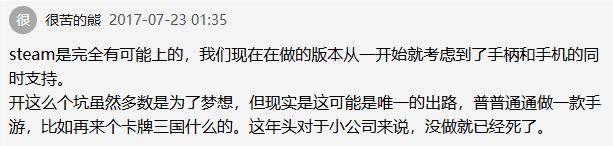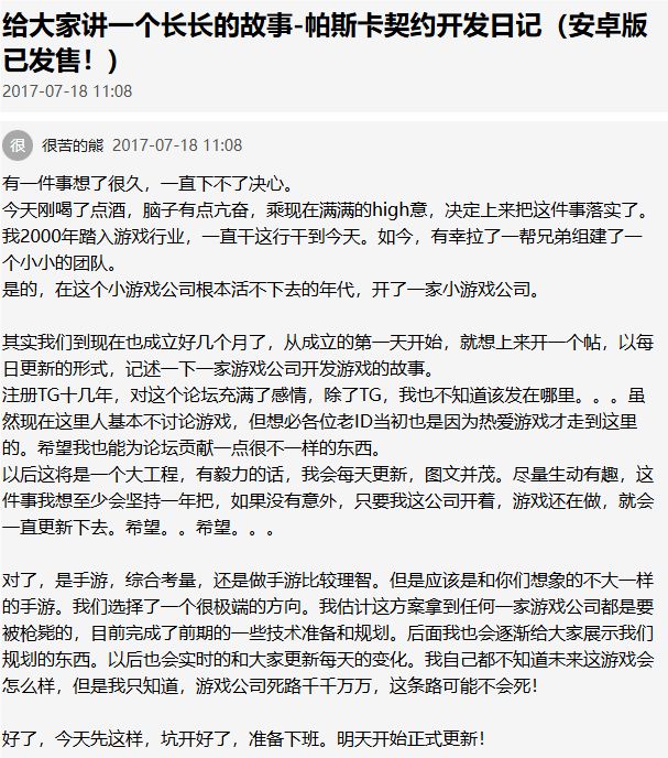 7月18日,下定決心的那天,激動萬分的楊洋趁着酒興在論壇發佈帖子,以開發日誌記錄的形式在心裏落實這件事。在帖子裏,他寫道,團隊選擇了一個極端的手遊方向,“這方案拿到任何一家遊戲公司都是要被槍斃的”。帖子獲得百千回覆,有吧友爲這份夢想送上支持,也有業內朋友出於善意勸他,這是選錯了品類,也選錯了平臺。