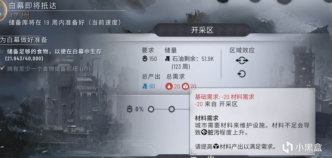 要注意的是,每个区域都需要一部分材料,建的设施越多,材料需求就越多!