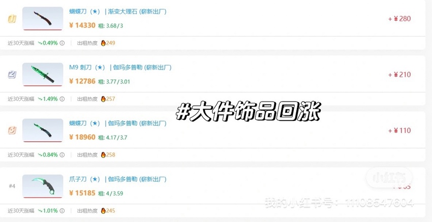 3、 百戰近期整體利好,租賃亦或出售利潤可觀,因而租賃玩家市場將會得到進一步擴張,預計熱門百戰將會持續走高,進而影響其他飾品指數,建議想入盤其他飾品(手套、刀具、冷門飾品等)可以靜候佳音,當百戰情緒達到閾值,主力資金將很大程度分流通貨飾品,如熱門刀型原皮;熱門手套及印花集系列。