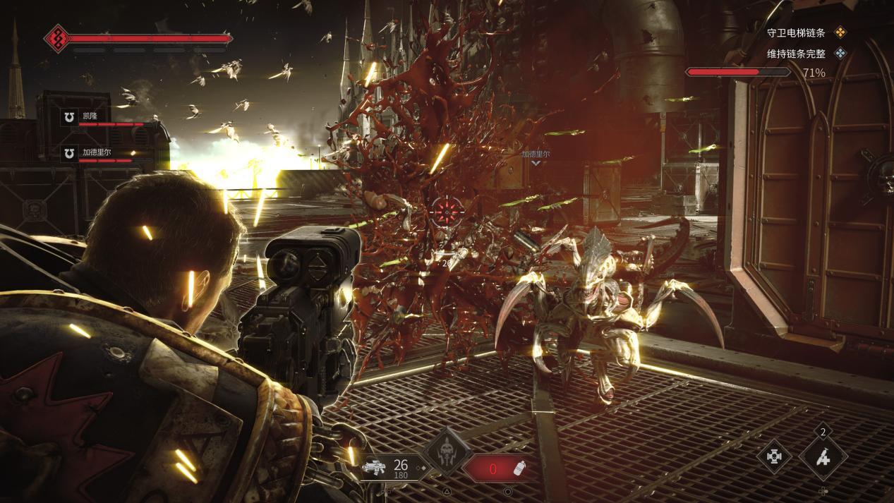 不得不說一句:本作的狙擊單位血量有點太厚啦!在我的遊玩體驗中,經常出現的情況是戰鬥剛開始、湧現出來的近戰單位還沒來得及近我身,遠方的狙擊手就已經把我騷擾地不厭其煩。於是乎爲了防止護甲進一步跌落,我肯定要先通過遠程武器做掉狙擊手,再回頭過來迎擊蟲潮。但在我好不容易清空了高血量的遠程單位之後,自身的護甲值已然損失大半,再低頭一看,蟲潮也業已湧到了我的臉上,此時被趕鴨子下架的泰圖斯只得在不完備的狀態下操起近戰武器同敵人搏鬥。