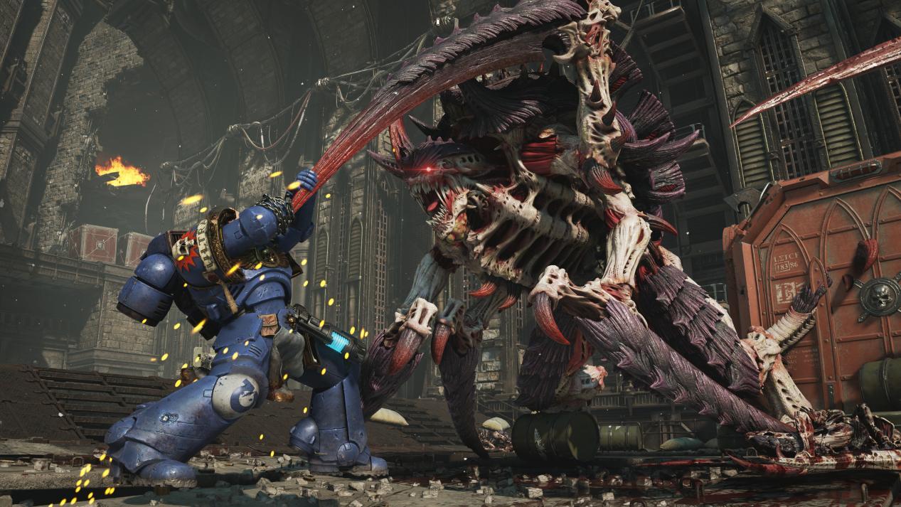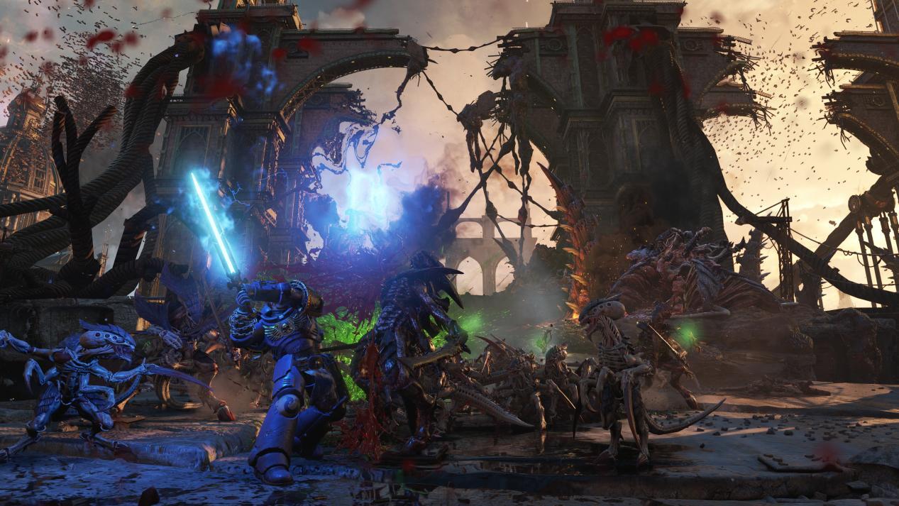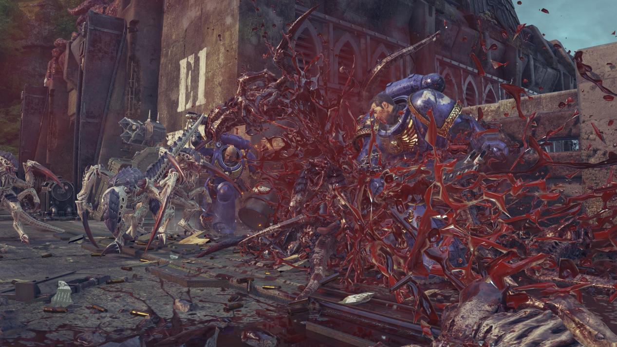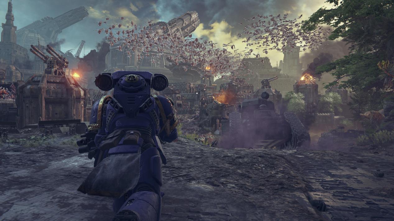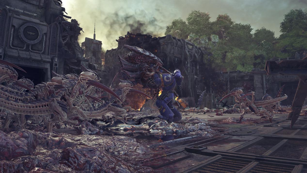 從踏上戰場的那一刻起,展現在泰圖斯面前的,是破碎的大地,是山般的屍體;是在圍攻下爆炸撕裂的坦克殘骸,是從空中如雨般墜落而下的蟲族孢子;是遠處直插雲天的哥特式科技建築,也是在深藍色太空背景下盤旋嘶吼的蟲族旋風。