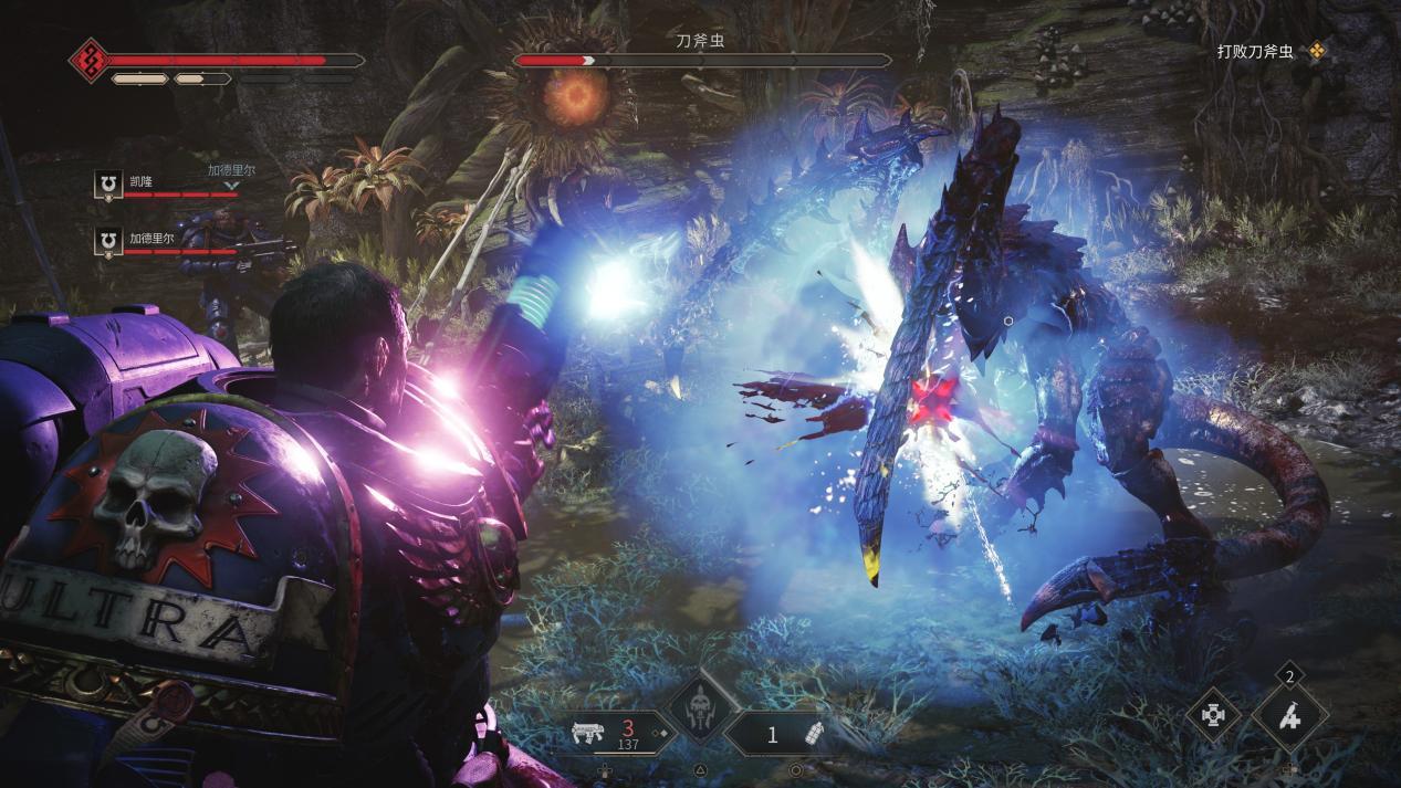 要知道,面對蟲潮時要想精確格擋它們的攻擊是不現實的,因此在近身搏鬥時我的注意力便會主要放在大型敵人的身上——只要能讓我打出槍決或者處決,那恢復的護盾就足以讓我立於不敗之地。輕視小兵的代價便是他們的攻擊雖不痛不癢,但累積起來還是攻破了我的護盾、讓我的血條受損、出現了白血條。