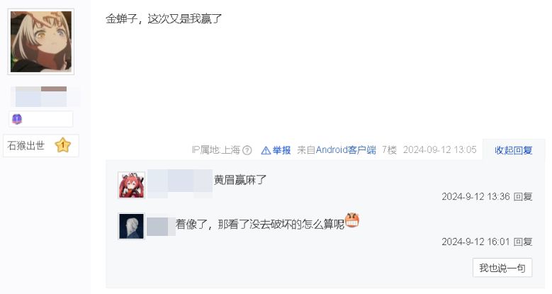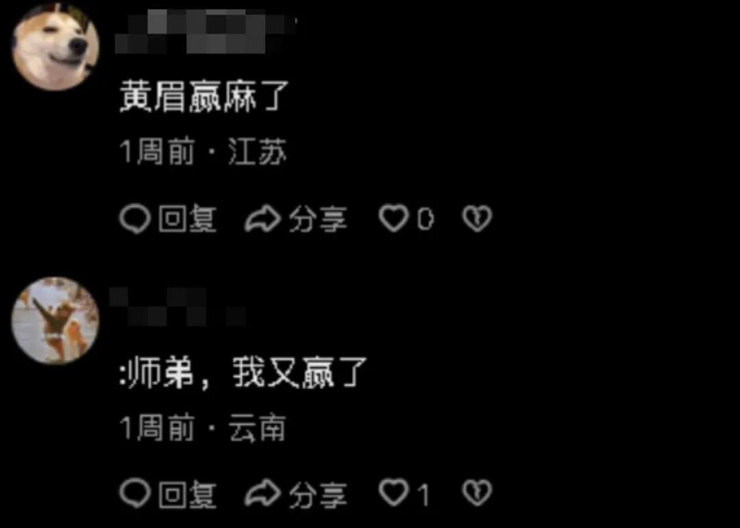 但在遊戲圈外更泛化的評論區,則會發現黃眉的金句出現頻率更高,像是“這一回,我又贏了,金蟬子”,還有“黃眉真的是贏了”“眉又贏”等等縮寫變體。