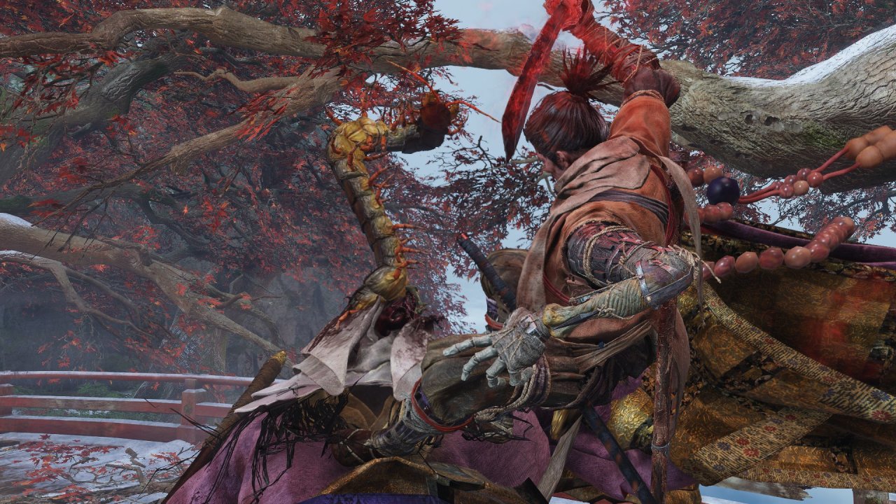 雖然它的三管血挺唬人,但其實在第一管血結束後,我發現我只要迅速的解除鎖定登上門口的樹枝,再對着它飛下就會出現紅點直接忍殺掉這個回合。