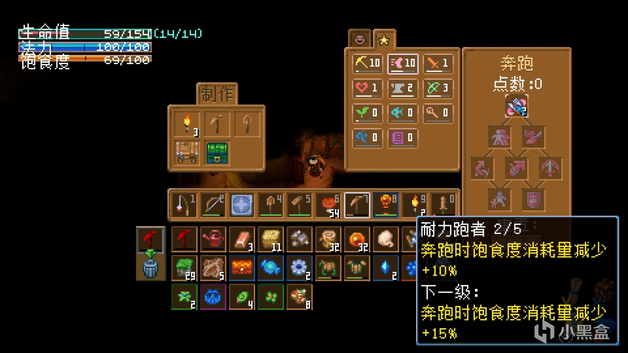 除此之外,挖掘探索世界之际玩家除了身上的资源装备等在不断与时俱进,其各种技能等级也随着锻炼而升级着。奔跑、制作、武器等都有着对应的熟练度,熟能生巧下能够减小很多消耗,提高工作效率,这种“长线养成”系统让玩家在游戏过程中始终有追求和目标,也让游戏体验更加充实和有意义。天赋当然也不能少,玩家可以根据自己的喜好和需求进行技能点分配,打造个性化的角色成长路线,比如挖矿小狂人,因为怕累全点产量上了.jpg。