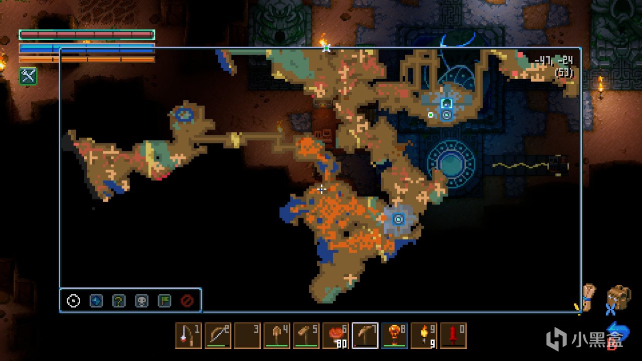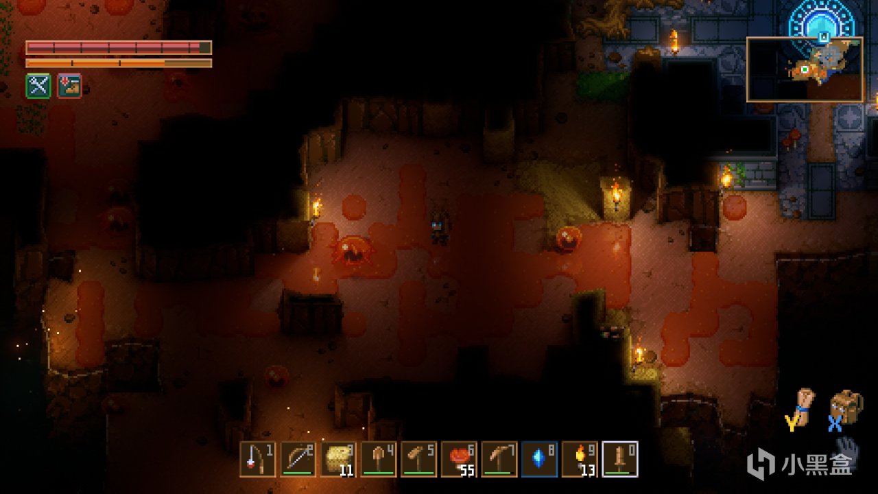 别看游戏流程听起来有点腻歪,但地底世界的神秘氛围和丰富的资源分布,在玩家广阔的探索下真的是惊喜连连。大部分都是黑暗环境和有限的光源设置,火把、提灯啥的都要准备就绪,如若摸黑行动让玩家在探索过程中充满了紧张和刺激感,有时候被攻击了都一脸懵逼。毕竟探索全程基本都需要玩家拿起工具不断挖呀挖呀挖,点亮地图把各处区域连通起来吧,即所设计的地下世界并非全部实心,这里还是有很多生物和环境遍布,各种柳暗花明式区域令人眼前一亮,不仅是新的怪物和资源,有的还有那像素美术的魅力,精致而优雅,但这并不会耽误玩家们的探索进度,毕竟各种玩法在后头呢!