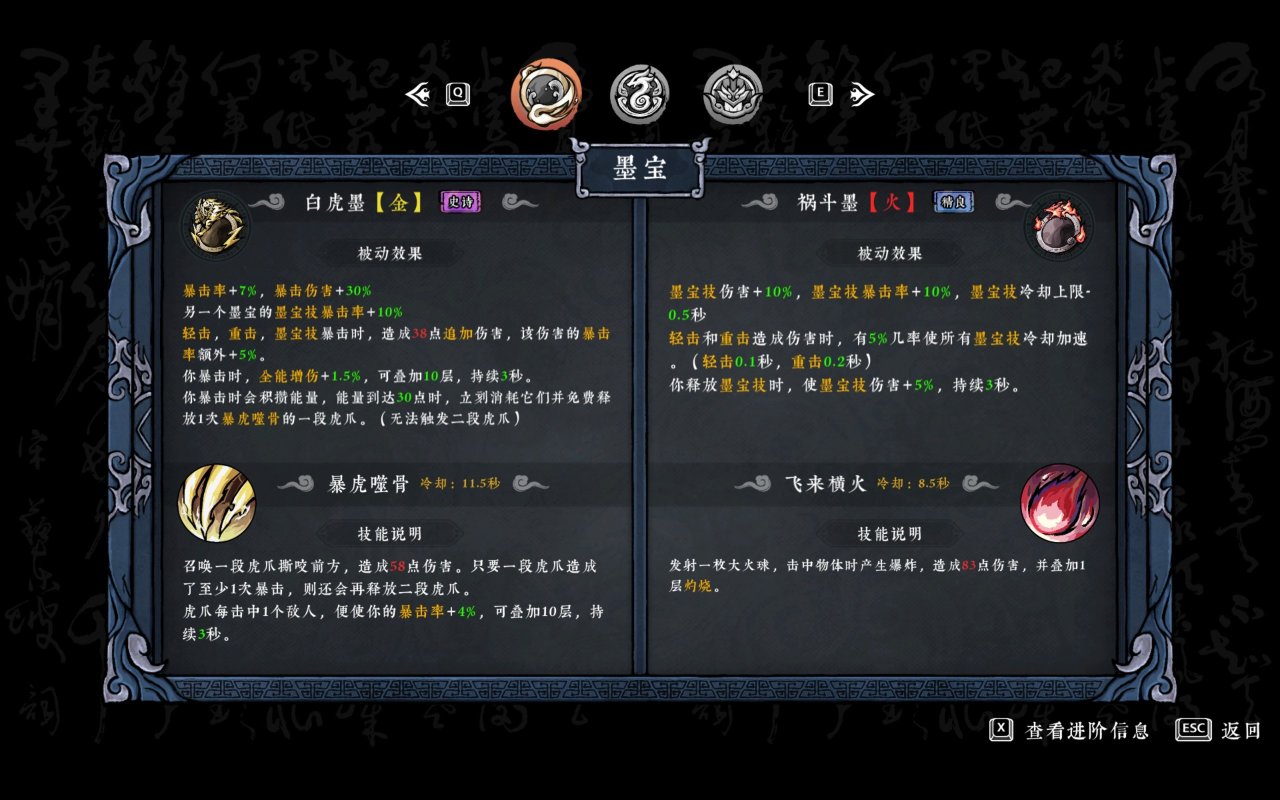 至於遊戲的構築方面,也是依照常理分爲局內和局外兩個部分。本作在局內構築上可以說是“極盡簡化”:玩家只有兩個技能格子,也就是「墨寶」。一個墨寶就對應了一種屬性,雖然有着不同的技能,但是墨寶構築無法進行更多拓展,換言之,「墨寶」是玩家的核心功法,決定了構築的方向,但本身無法繼續進修。