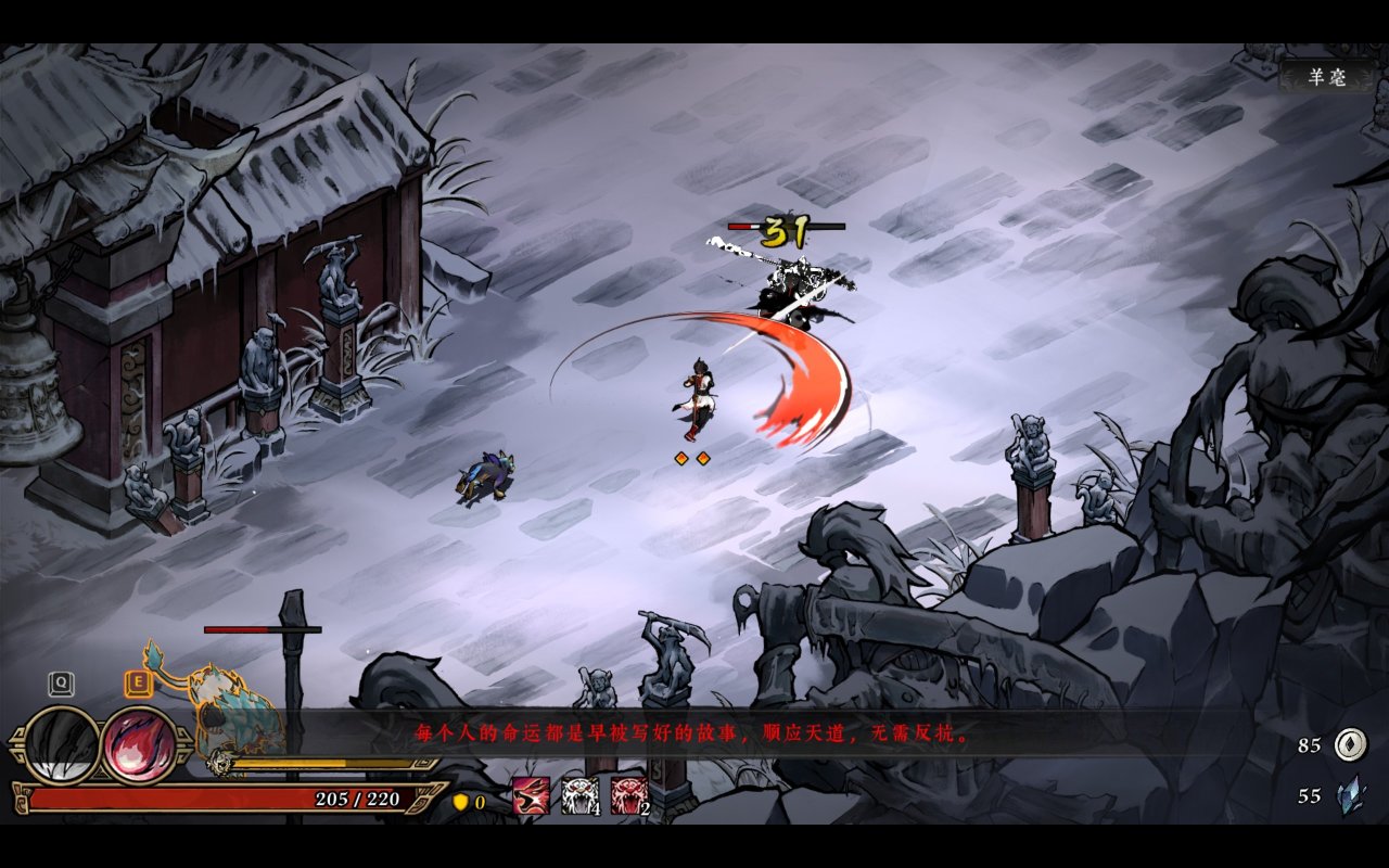 在《哈迪斯》之後,多數動作類肉鴿在選關上都會有一點前者的影子。這其中的佼佼者叫《暖雪》,不僅是學到了其中匠心獨具的短關卡設計,更是把在《哈迪斯》中本就激爽的動作手感進一步放大,形成了一套以超高速平A爲基礎的獨特戰鬥體系。自此,所有的國產肉鴿或多或少都朝着《暖雪》的方向看齊,不過都只是照貓畫虎,除了都叫國風以外在構築上幾乎沒太多相同點。