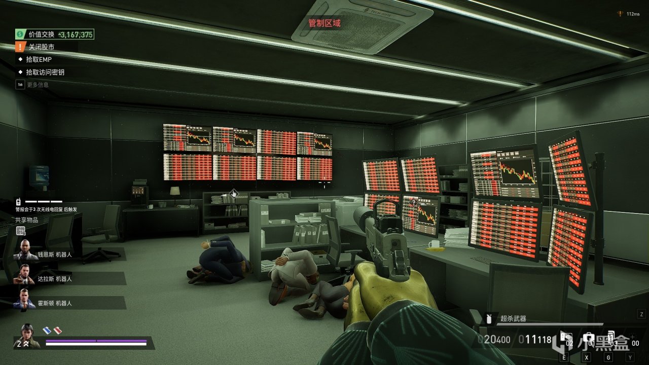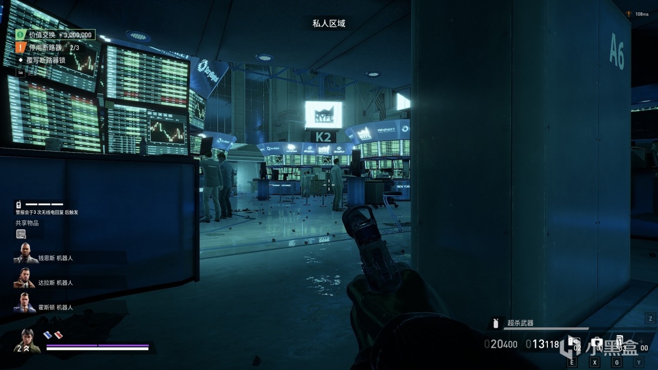 扯回劫案本身吧,说实在的,作为首个季票的收尾劫案,Payday3显得有些虎头蛇尾了。潜行与强突,本就不是一个完全对立的选择,在大多数的劫案之中,玩家都可以不戴面具、仅靠潜行完成整个劫案;而“恐惧与贪婪”呢,它的场所股票交易中心本就有着众多的平民与摄像头,却又强制玩家戴上面具开始游戏,对潜行来说可以称得上史诗级核打击。在“恐惧与贪婪”中,可谓是处处有平民、哪哪都是人,稍有动作便是四面八方的警示亮起,ovk难度下潜行起来可太糟糕了。