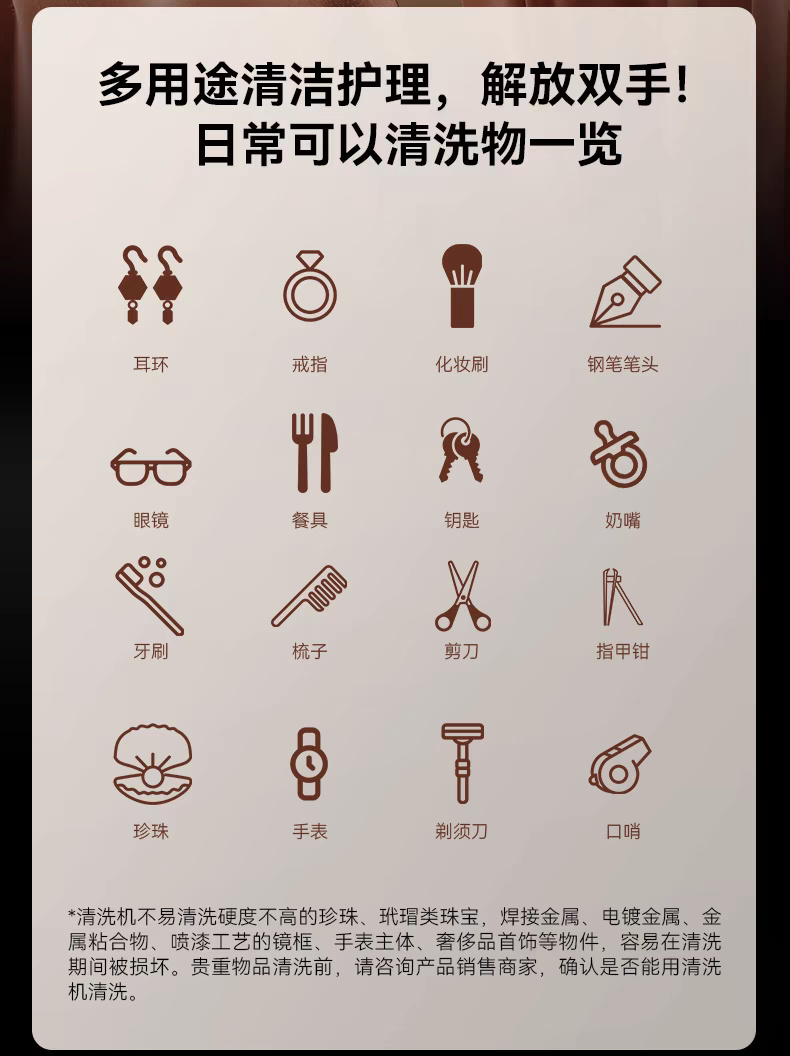 除了洗眼鏡之外,也可以洗首飾、剃鬚刀片、鑰匙、牙刷等各種物品,當然清洗前先要諮詢商家,是否可以使用超聲波清洗機清洗。