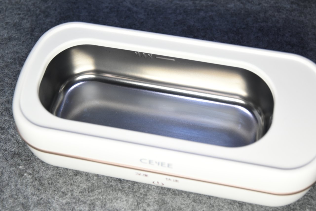 清洗機內部的容量空間也比較大,爲420ML,我試了下四個舍友和我的眼鏡,放進去後在達到水位線前都可以被水浸沒。清洗機的內壁採用了完整的食品級304不鏽鋼,安全耐用,清潔起來也比較容易。