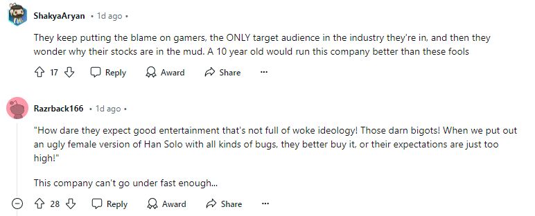 伊夫·吉勒莫特最近在投资者电话会议上说:“如今的玩家期望过高,仅凭借高质量游戏,已经无法满足他们的需求”。他认为《星球大战:亡命之徒》失败有部分原因在于粉丝。许多人在游戏推出之前就对其进行批评,而这些不好的言论影响了其他人购买这款游戏。