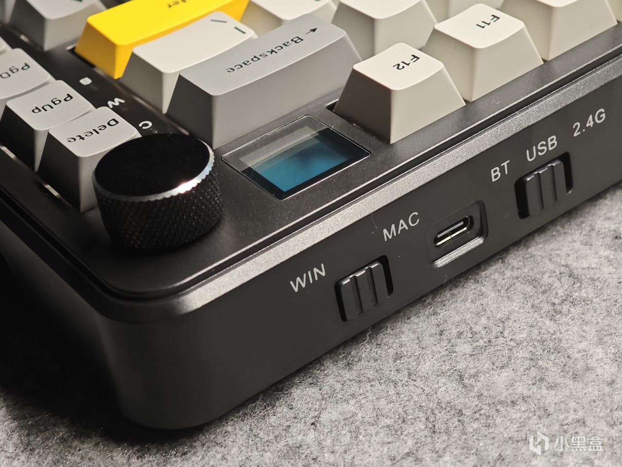 鍵盤支持有線、藍牙、2.4G無線連接,有線:1000HZ藍牙:125HZ、2.4G:1000HZ。頂部是模式切換開關和WIN/MAC切換開關,鍵線分離、方便攜帶。電池容量爲4000mAh,但是4000mAh的電池確實太小了,本身磁軸的功耗比較大,加上小屏幕是更加耗電了。
