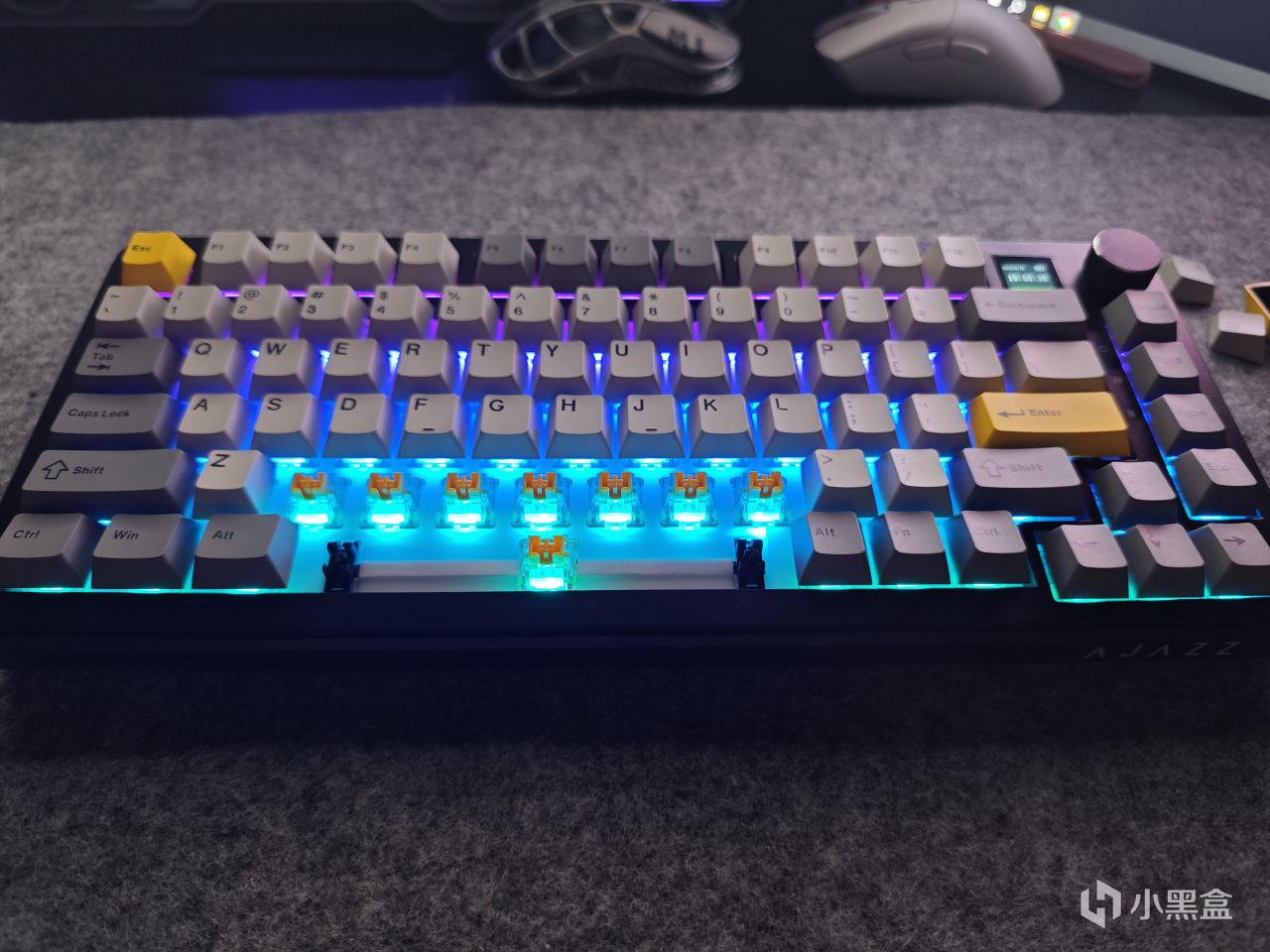 鍵帽採用的是原廠PBT三拼色鍵帽,PBT材質經久耐用,不易打磨。觸感細膩,打字手感舒適,長時間使用表面也不易有油光。