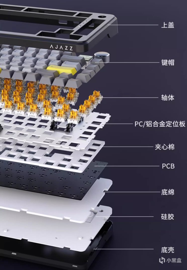 鍵盤採用Gasket結構,支持全鍵無衝、全鍵熱插拔。內置po棉+硅膠底棉+EVA棉三層消音填充,按壓軟彈的同時進一步減少按鍵的空腔音,總體的按鍵手感不錯。