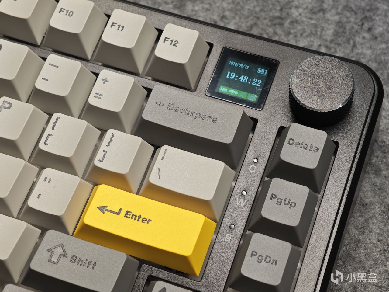 鍵盤的右上角有個多媒體旋鈕,上面做的防滑處理,摸起來手感不錯,旋轉時靜音,可以調節音量和光效,非常方便。旋鈕旁邊就是一個鍵位大小的小屏幕,是0.85寸的TFT彩屏,裏面可以更改圖片和動圖顯示。
