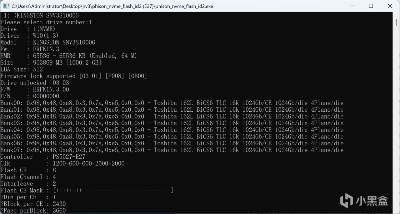 這次測試的1TB版本主控是來自羣聯的PS5027-E27,是一款主打高性能低功耗的主控,應該是金士頓專門定製的,羣聯官網只有E27T沒有E27。顆粒還是金士頓自封片,2顆512GB(8Tb)容量組成了1TB的總容量。