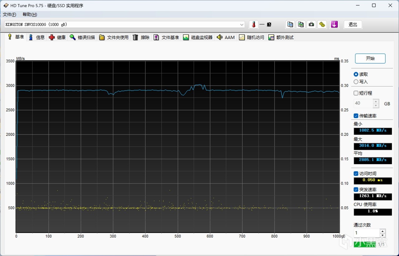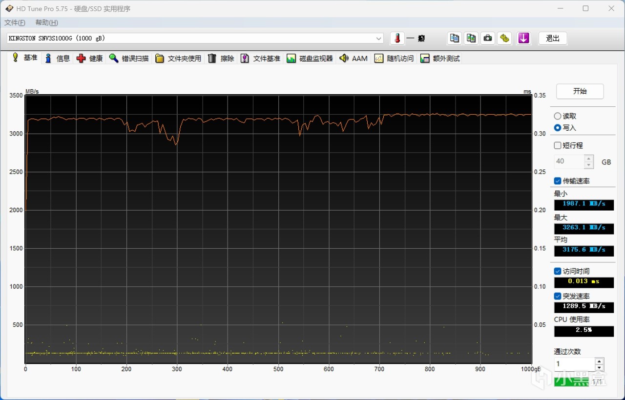 HDTune寫入和讀取測試,基本就是一條直線,神奇的是全盤寫入竟然沒看到緩外成績......實際全盤寫入600GB左右,此時仍在緩內速度,寫入速度在3.2GB/s左右,這個盤有點東西!!!