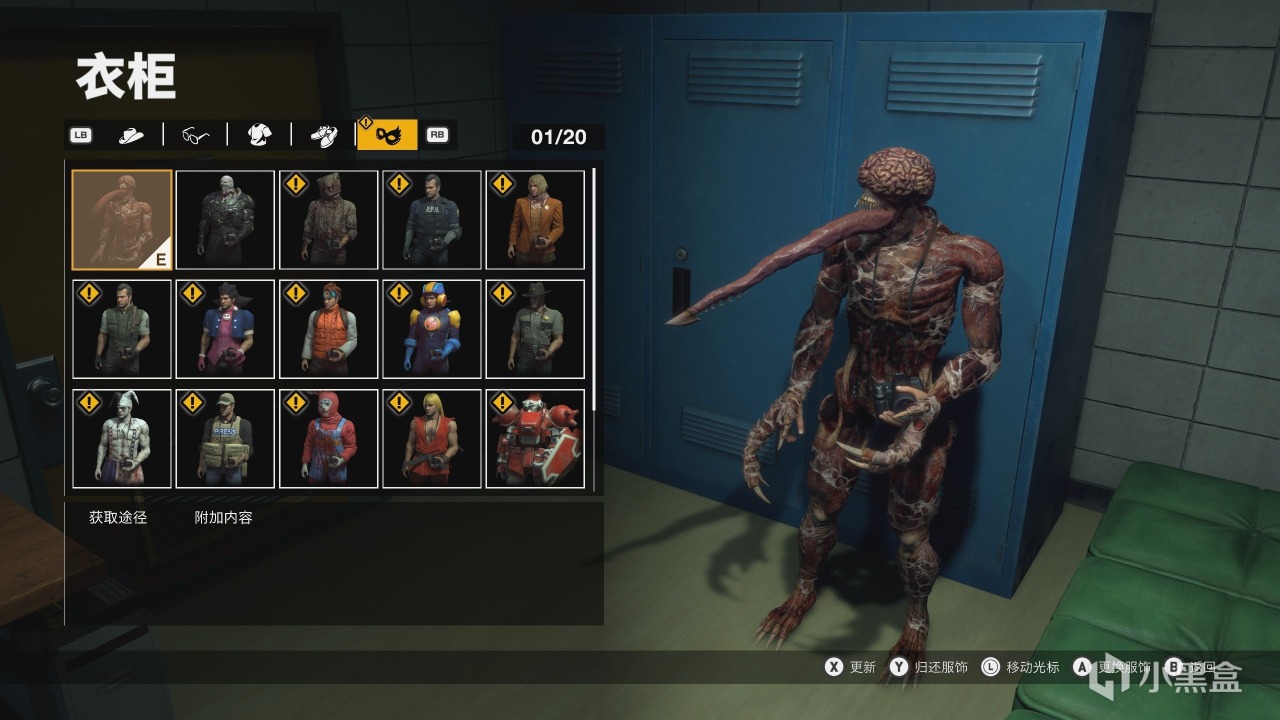 卡普空在保安室的更衣櫃中,除了一些原版服裝之外,還新增了20套新衣服,上演了“喪屍暖暖”。這些服裝涵蓋了卡普空旗下的所有遊戲IP,如男扮女裝版“礙事莉”、彷彿真的從生化裏走出來的逼真舔食者和暴君,以及克里斯、洛克人、光熱鬥、杜克姆等經典角色的服裝重現,甚至每個服裝還有專屬音效。這不僅展現了卡普空對自家遊戲的搞怪惡趣味,同時也爲玩家的視覺觀感增添了十分強烈的衝擊體驗。