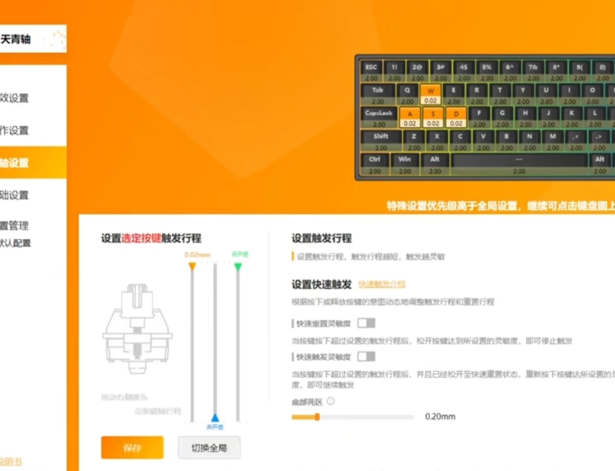 整體下來沒有什麼缺點,你喜歡用網頁就用網頁,喜歡用軟件就軟件。至於設置的話,因爲我本身不是那麼能感受那麼低的精度,主要以穩定性爲主,所以全都設置的0.2,大家可以套用在任何的磁軸鍵盤上(本人玩瓦和CS居多)