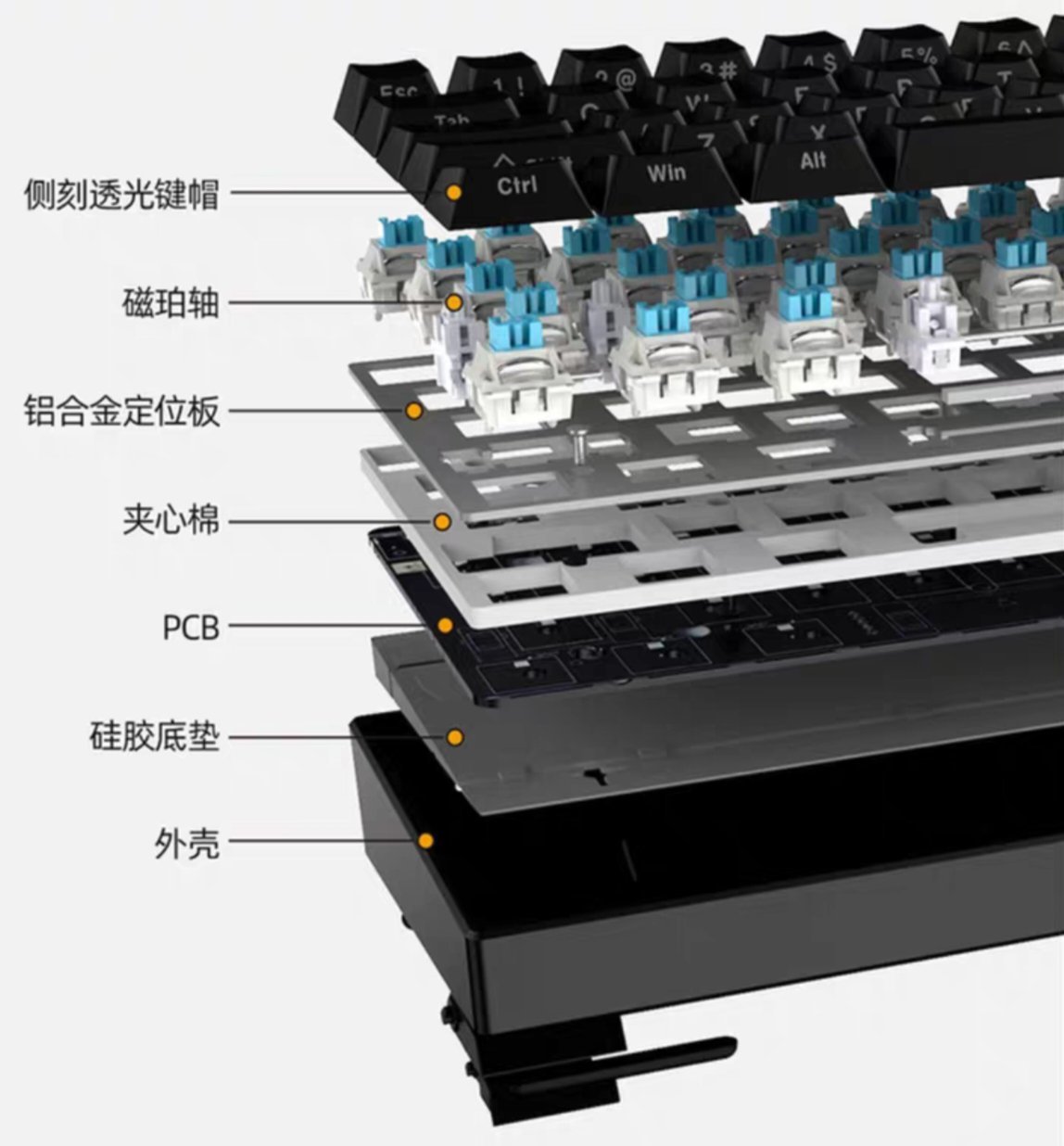 結構方面還是老樣子嘛,磁軸廠商大家都愛用的船殼。大家都知道,目前的很多磁軸鍵盤之所以不採用GASKET結構,那是因爲太過軟彈可能會導致鍵盤誤觸,因此他們爲了保證整體的一個穩定性,大部分用的都是船殼結構或者說加裝一塊金屬定位板