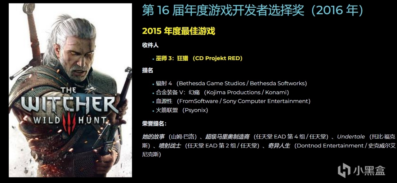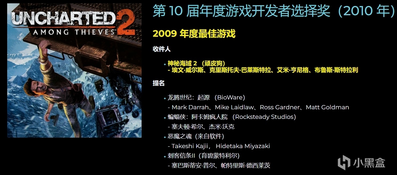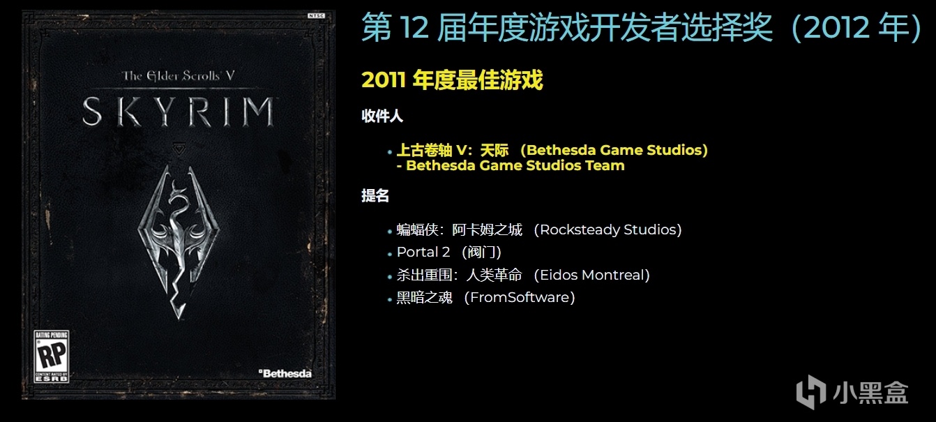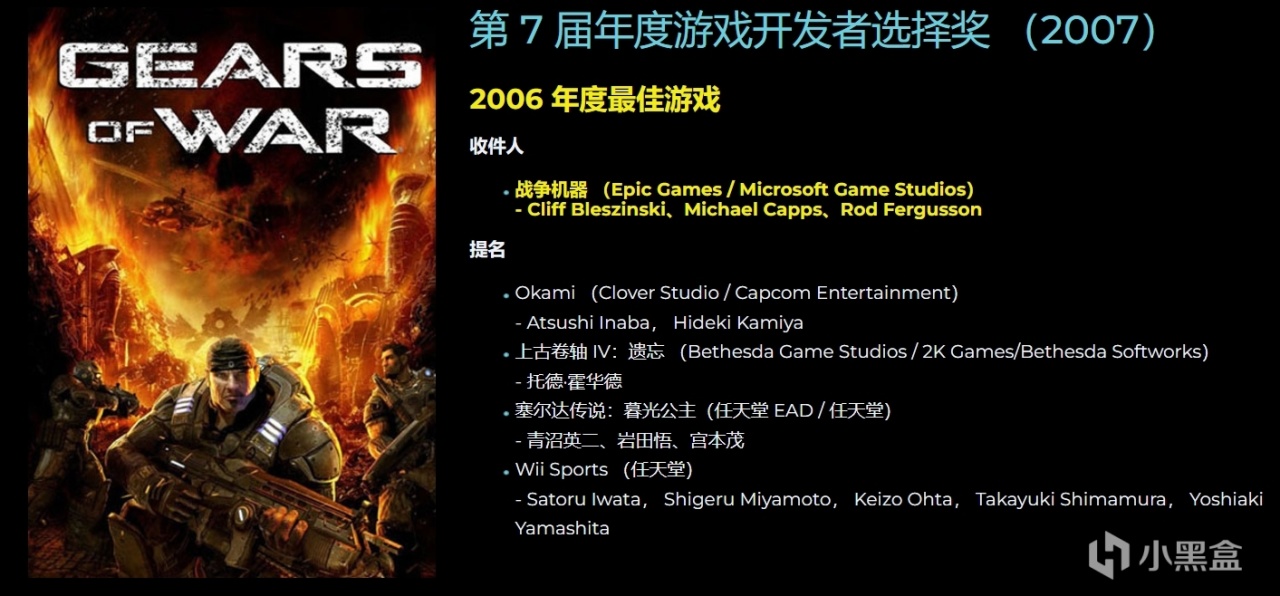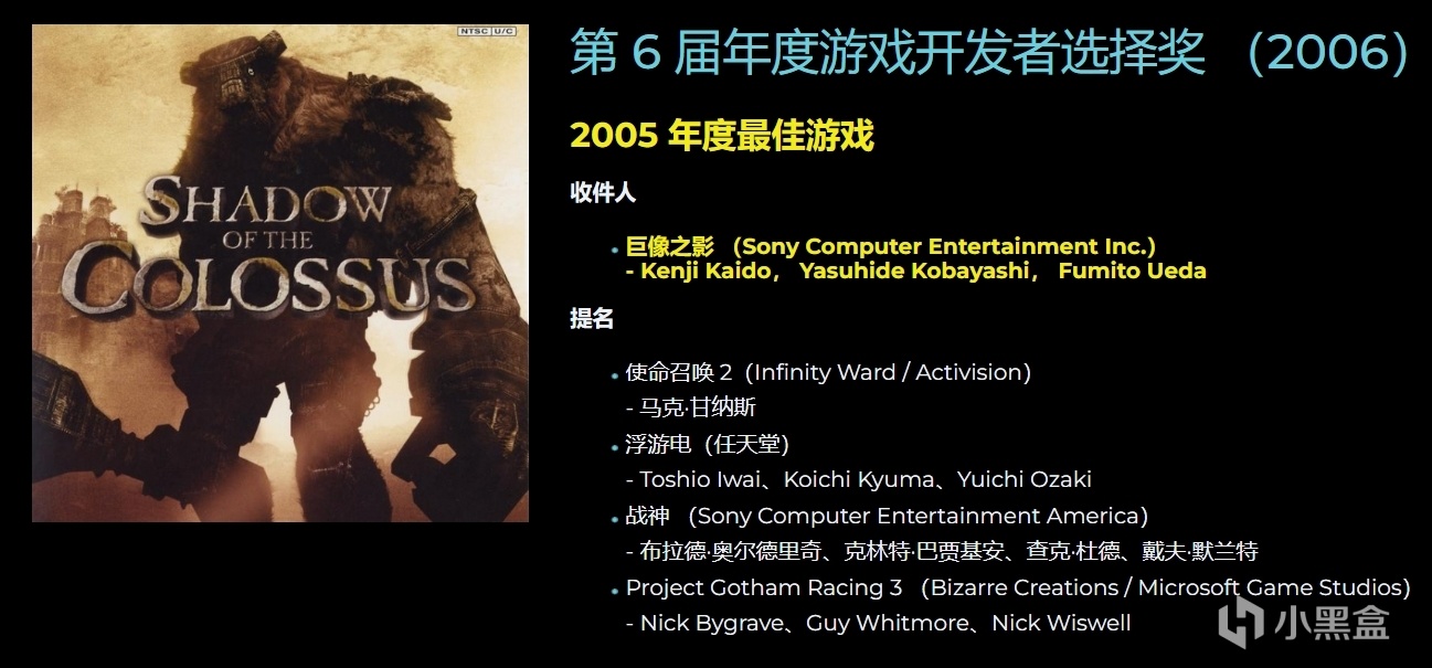 (注意:獲獎名單的公佈和頒獎典禮均在遊戲發佈的次年舉行,就是說本年評選的是上一年的遊戲)