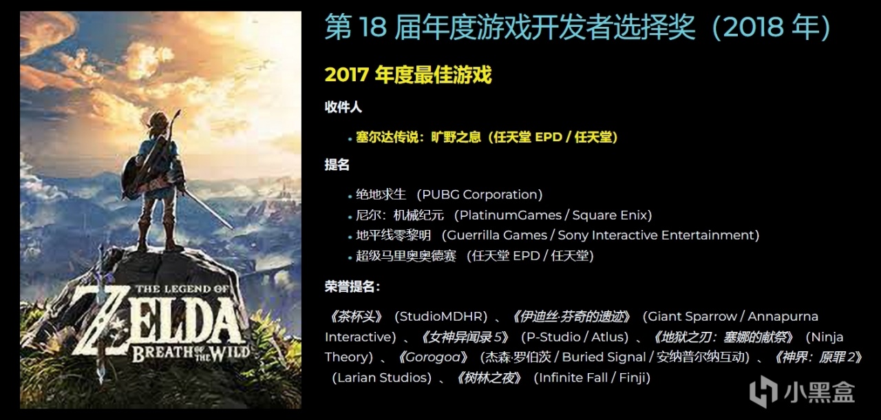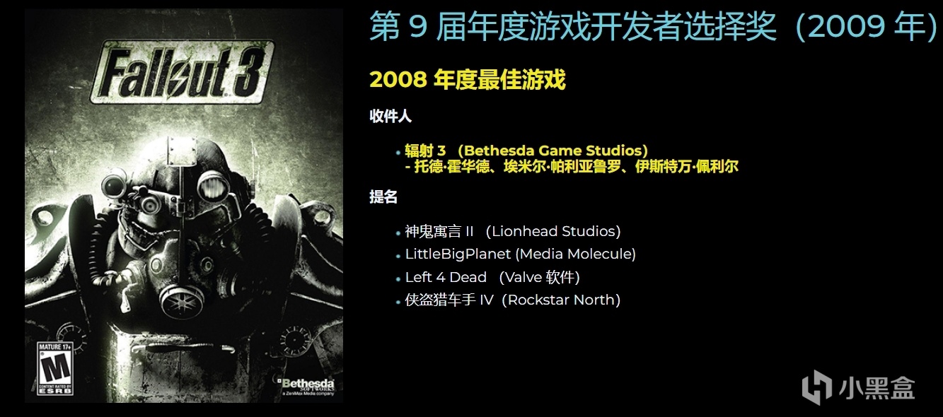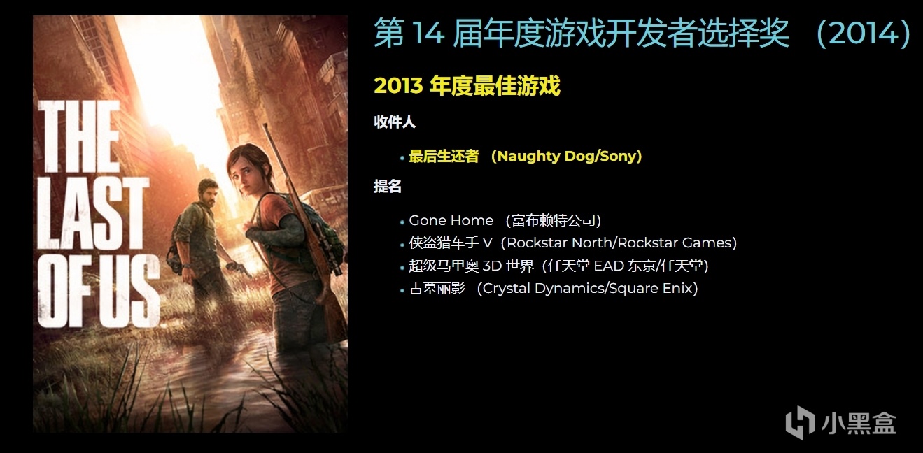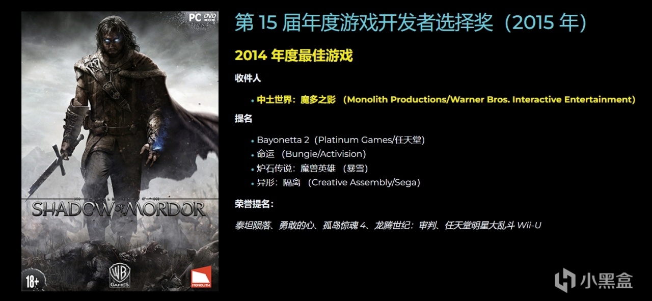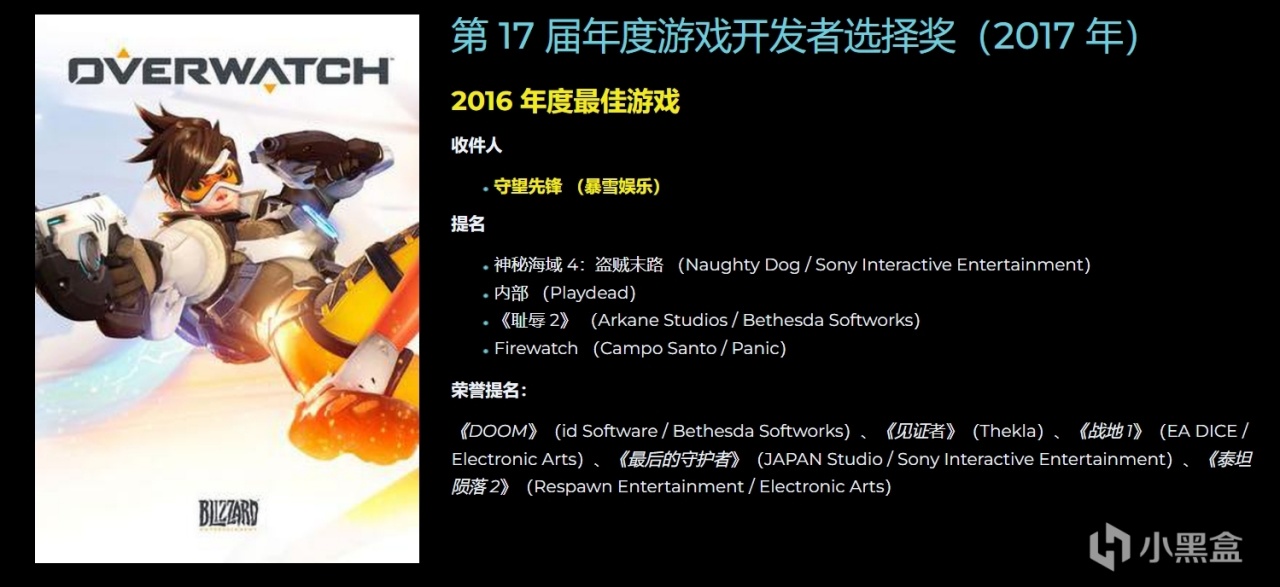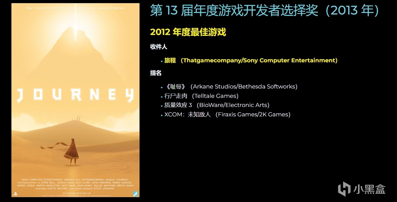 (注意:獲獎名單的公佈和頒獎典禮均在遊戲發佈的次年舉行,就是說本年評選的是上一年的遊戲)