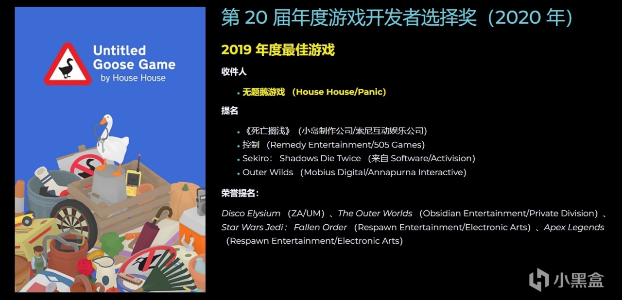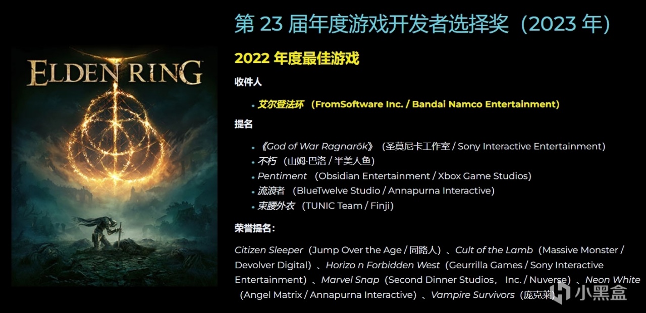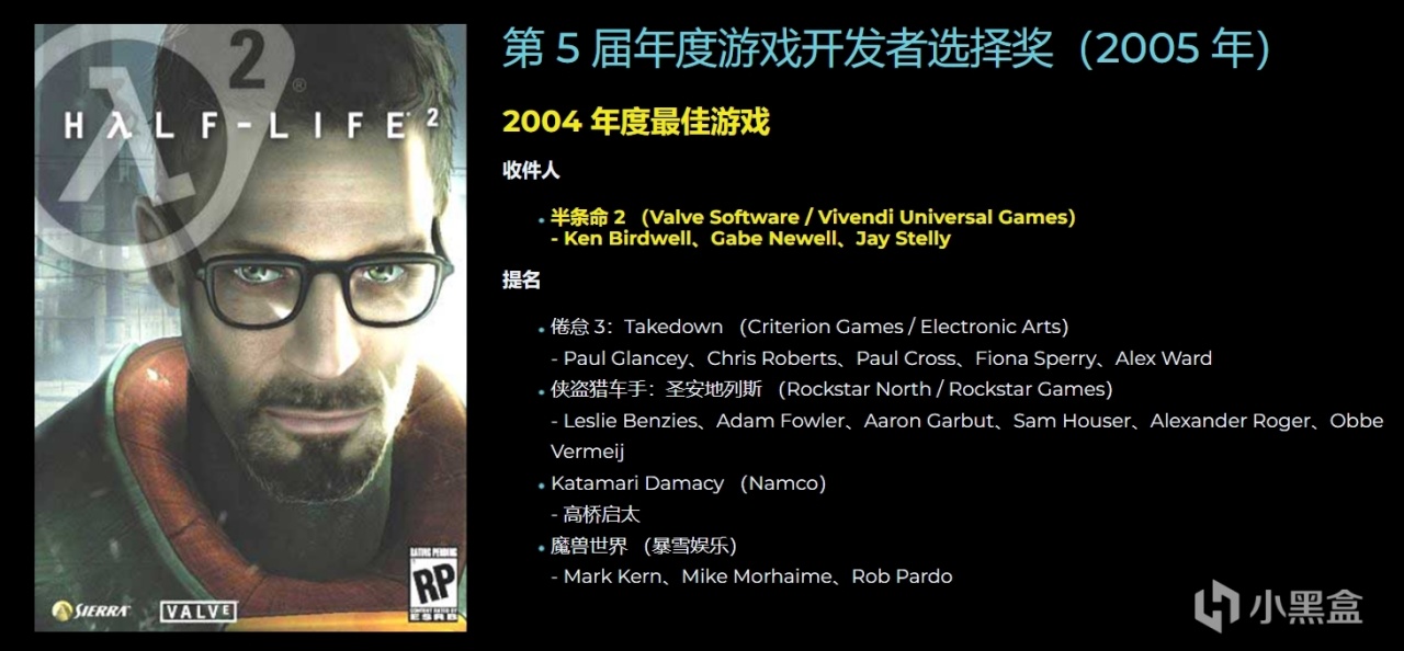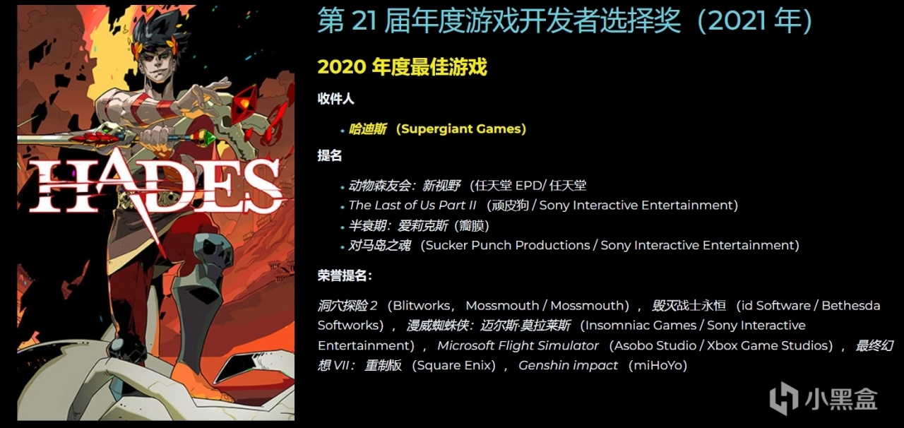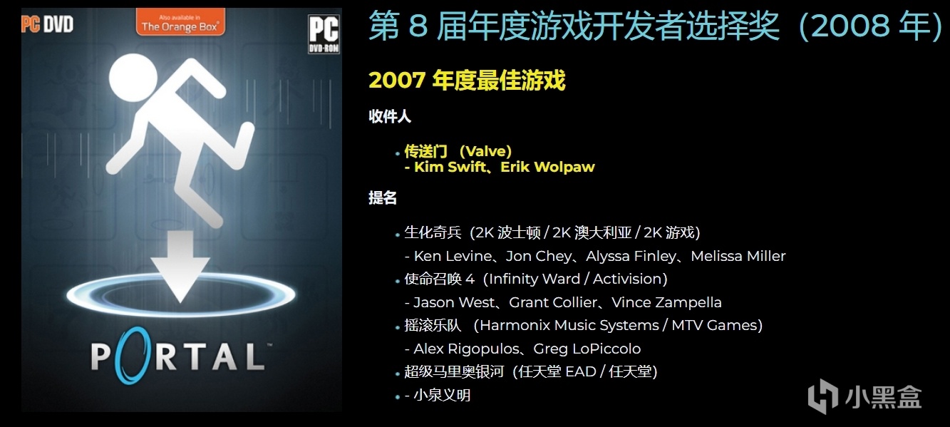 (注意:獲獎名單的公佈和頒獎典禮均在遊戲發佈的次年舉行,就是說本年評選的是上一年的遊戲)