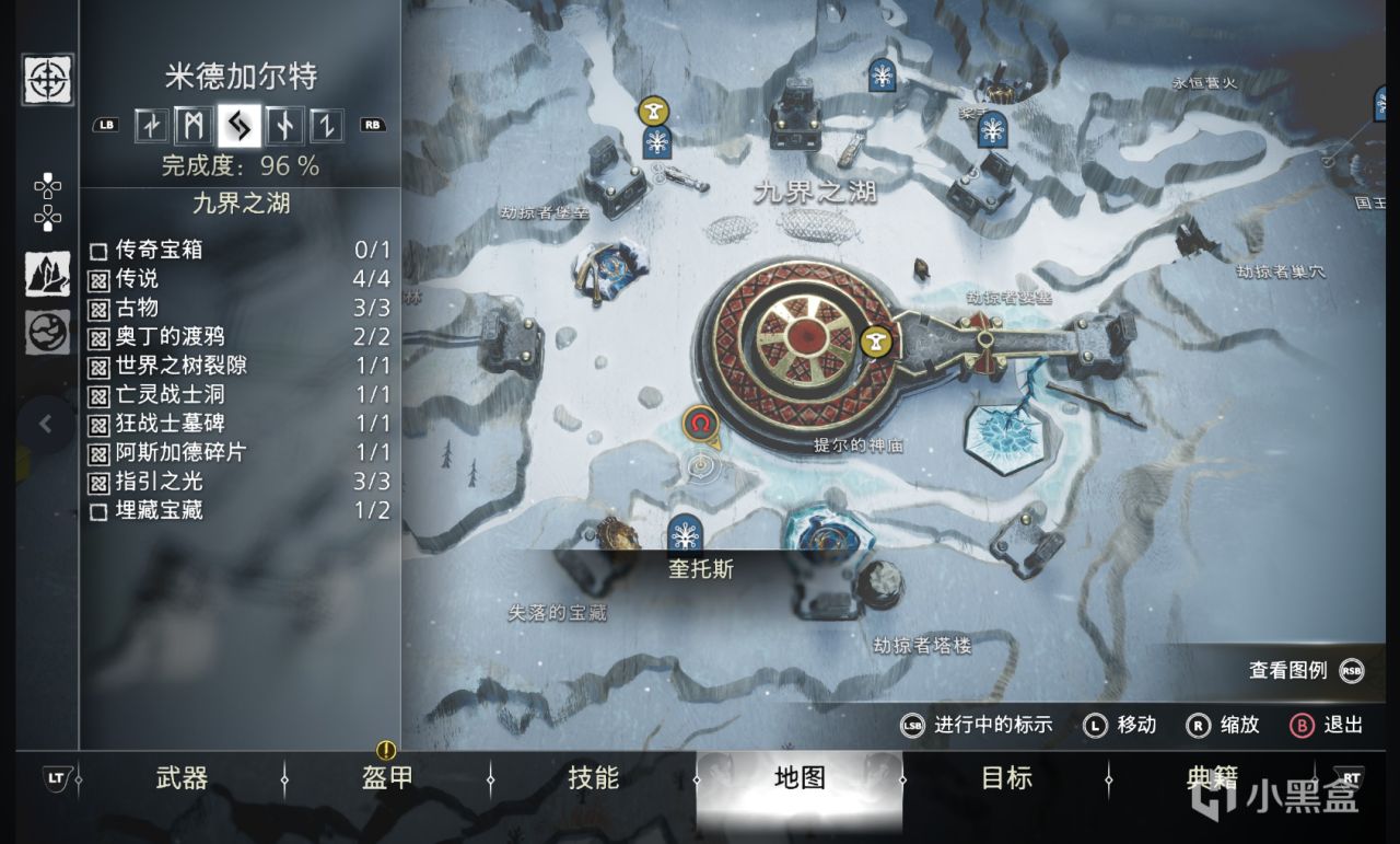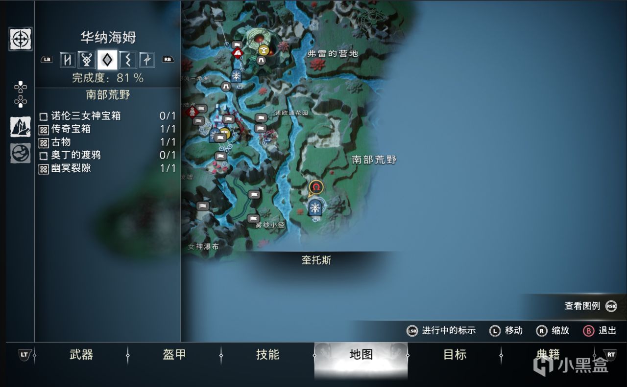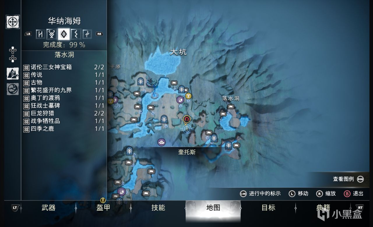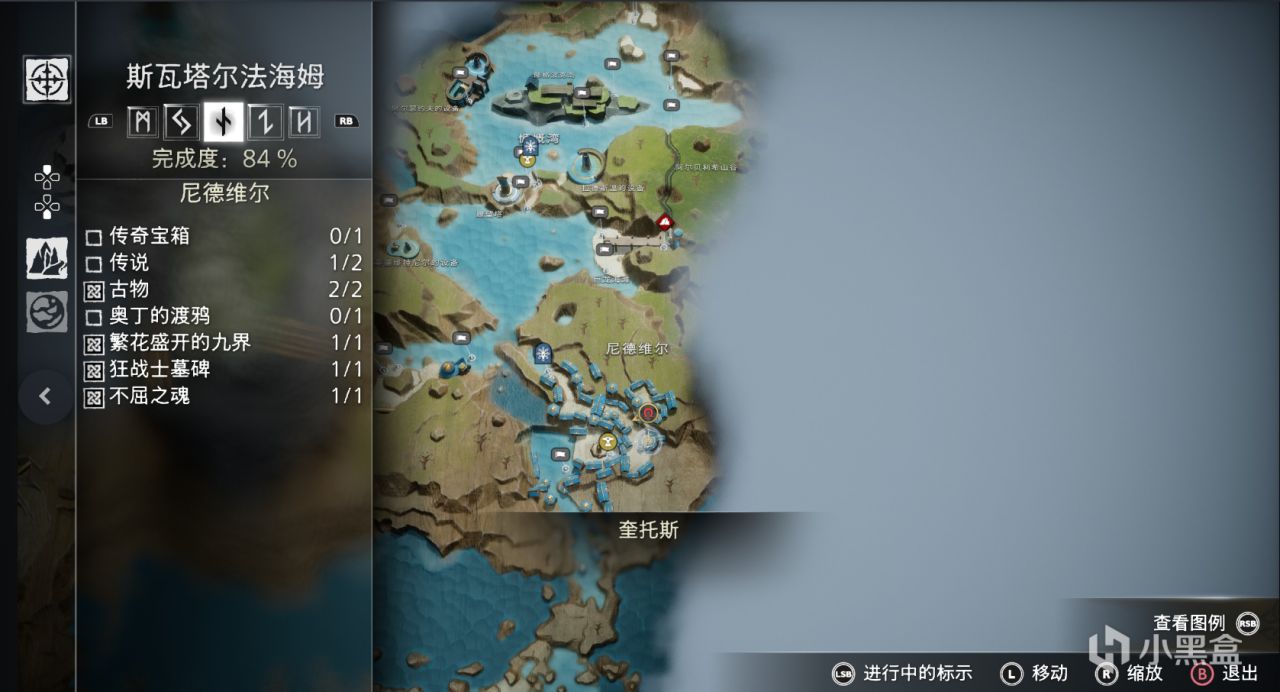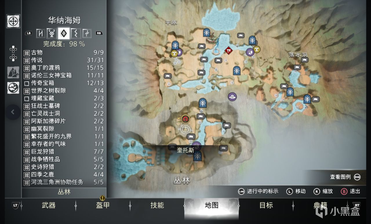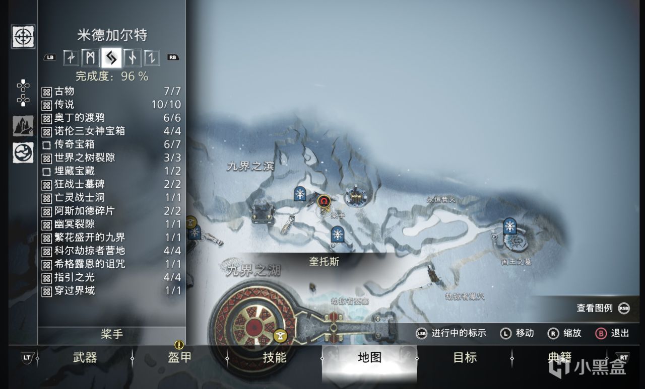 首先聲明:標在地圖上的普通的需要收集的東西爲:30個諾倫女神寶箱、全渡鴉、全古物、14個劍柄即可,傳說,傳說寶箱不需要全收集。