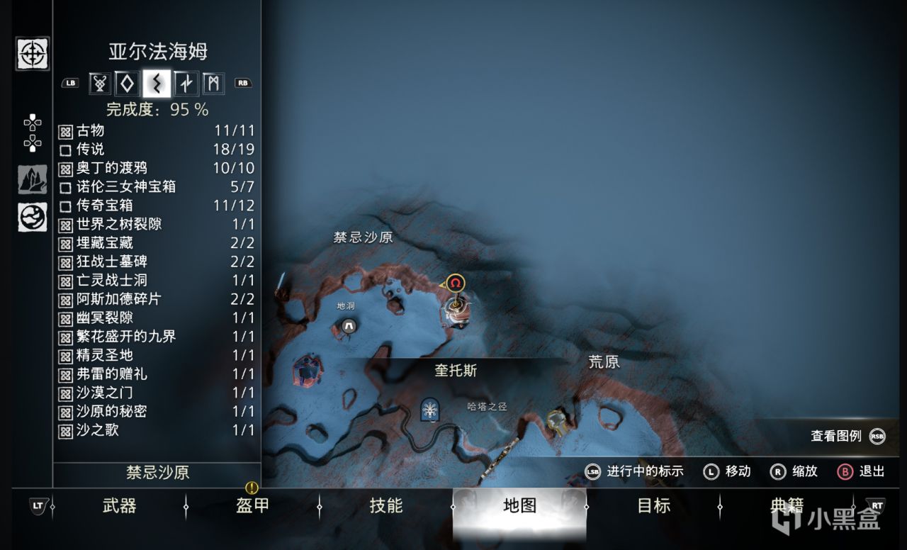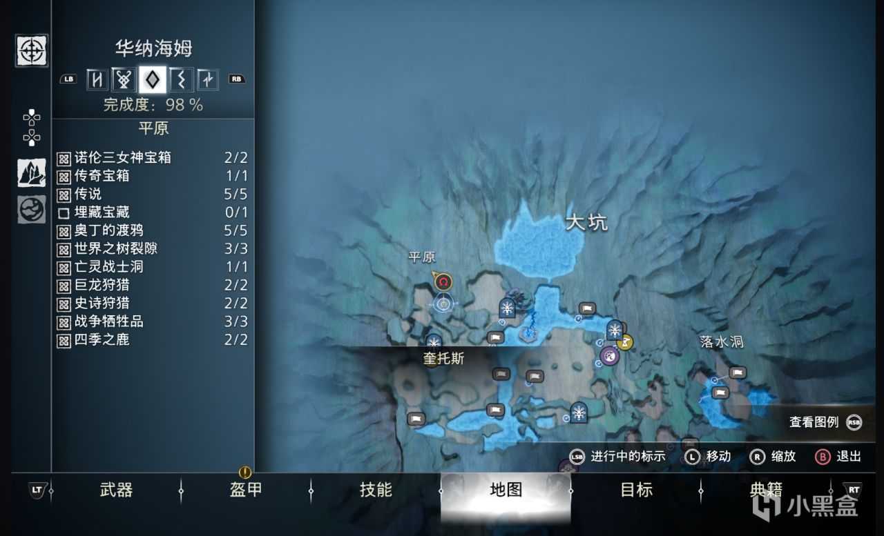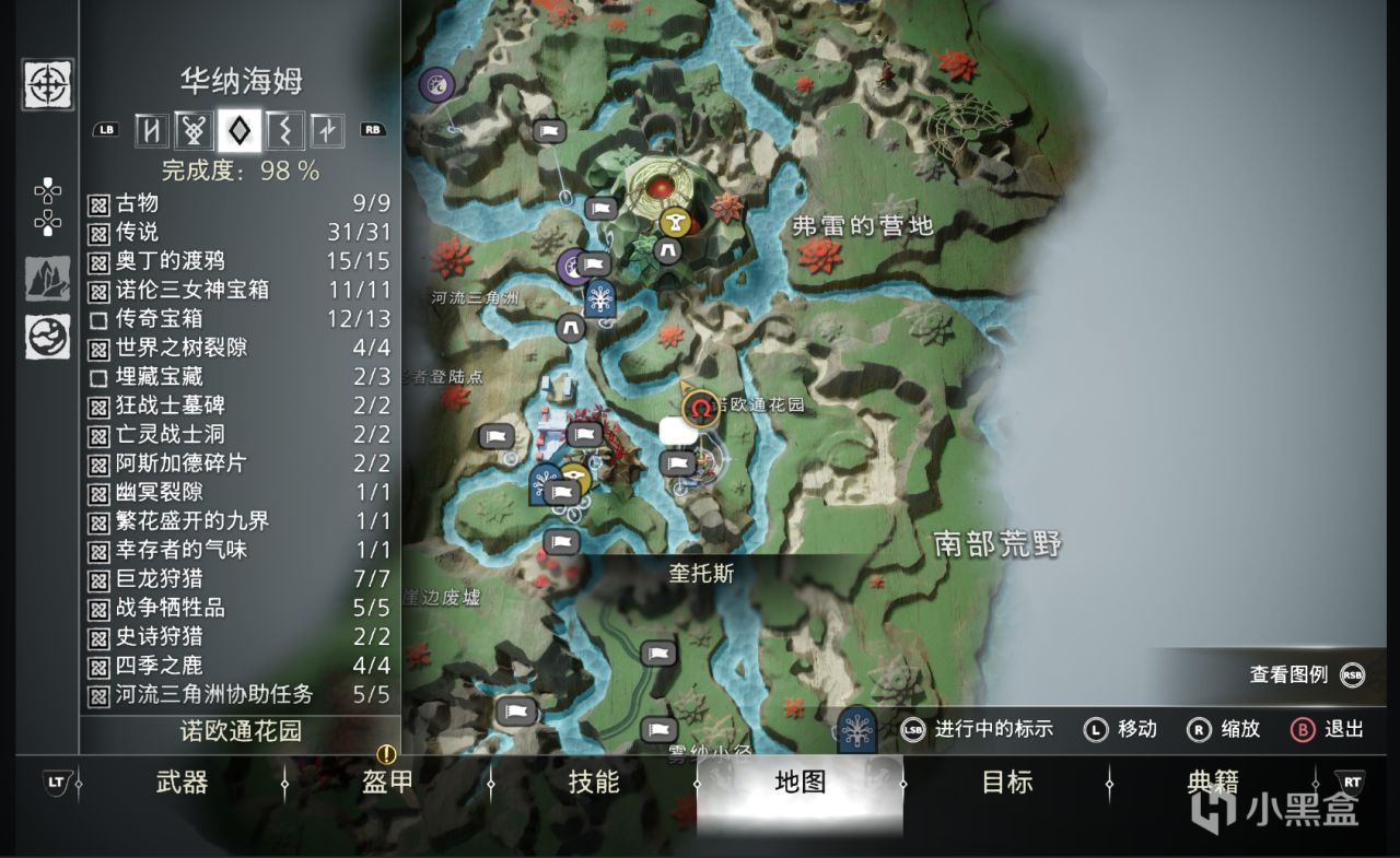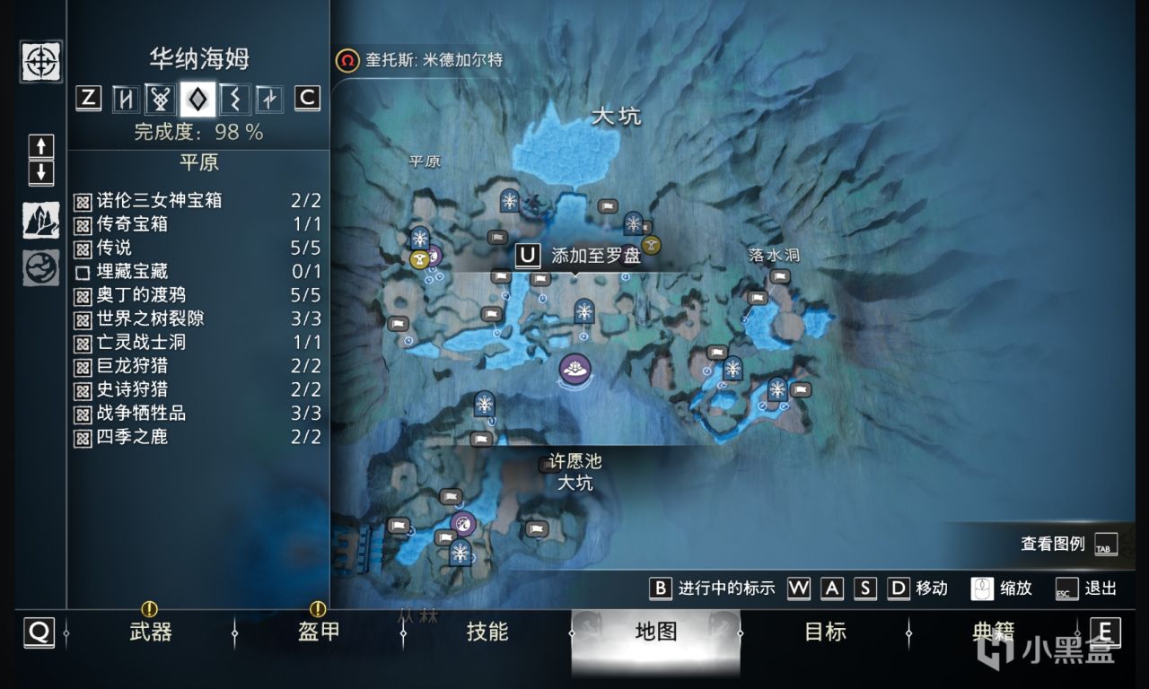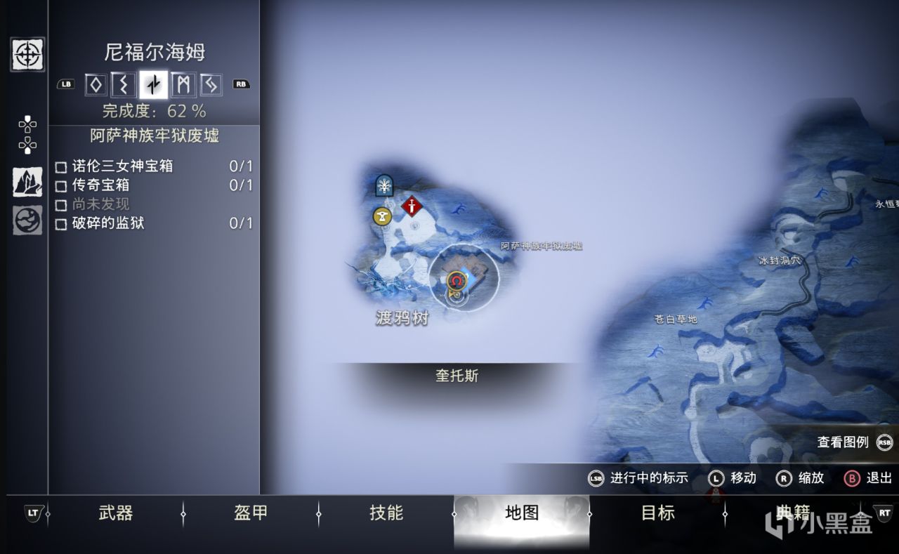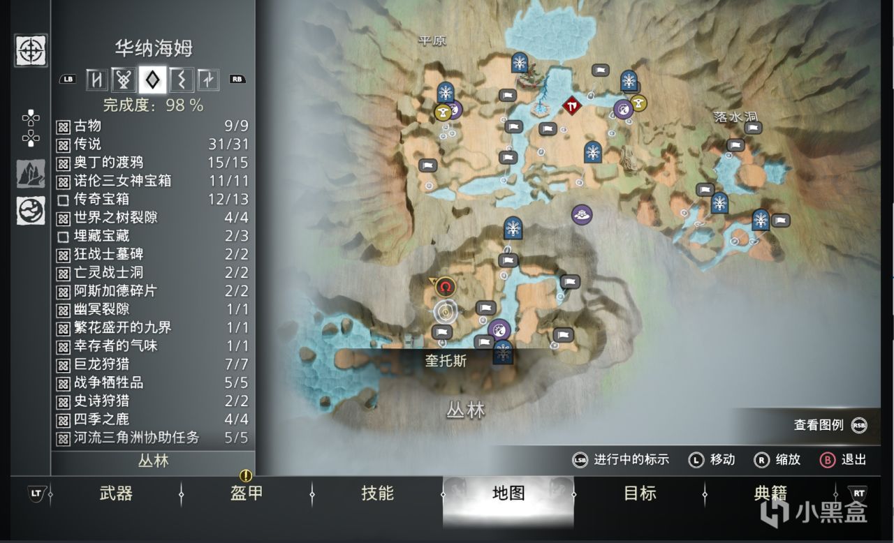 首先聲明:標在地圖上的普通的需要收集的東西爲:30個諾倫女神寶箱、全渡鴉、全古物、14個劍柄即可,傳說,傳說寶箱不需要全收集。