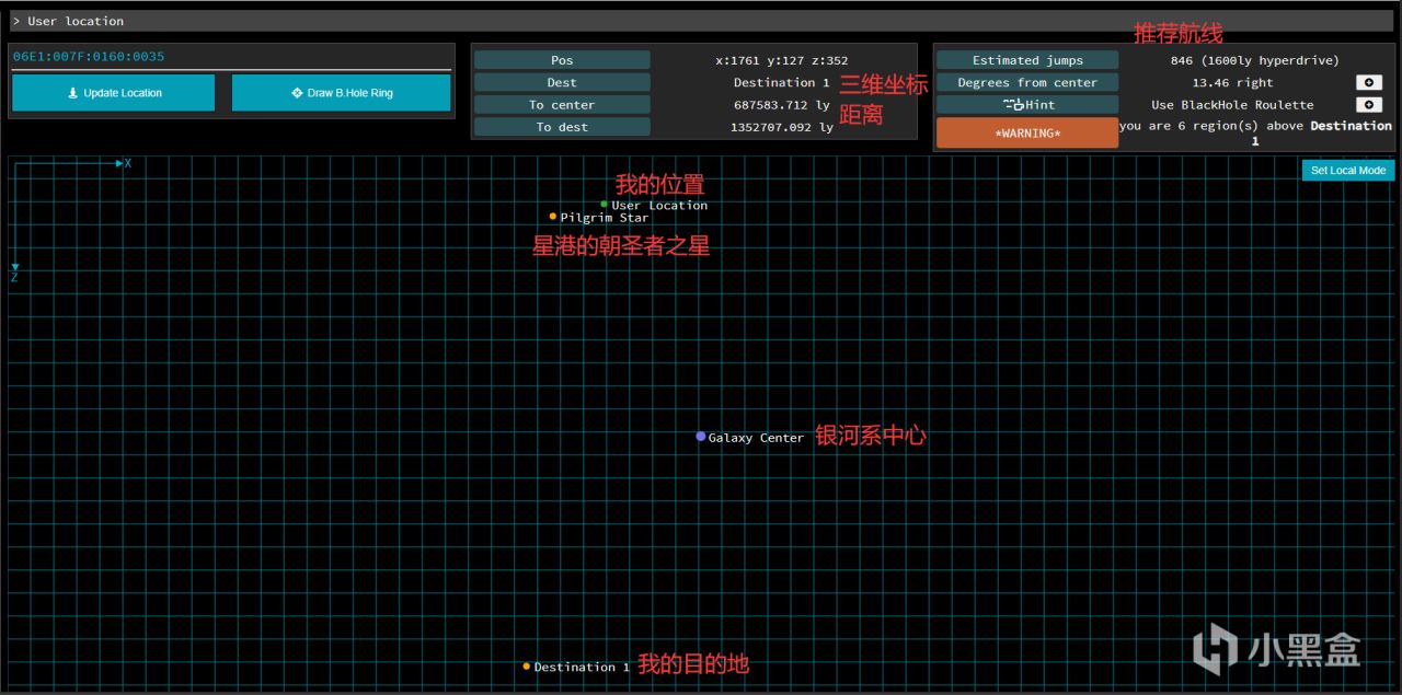 星港的聯合創始人pahefu做了一個導航工具,通過輸入你的座標和目的地座標,算出在銀河系的三維空間座標(XYZ)、距離(光年ly),並提供航線推薦。