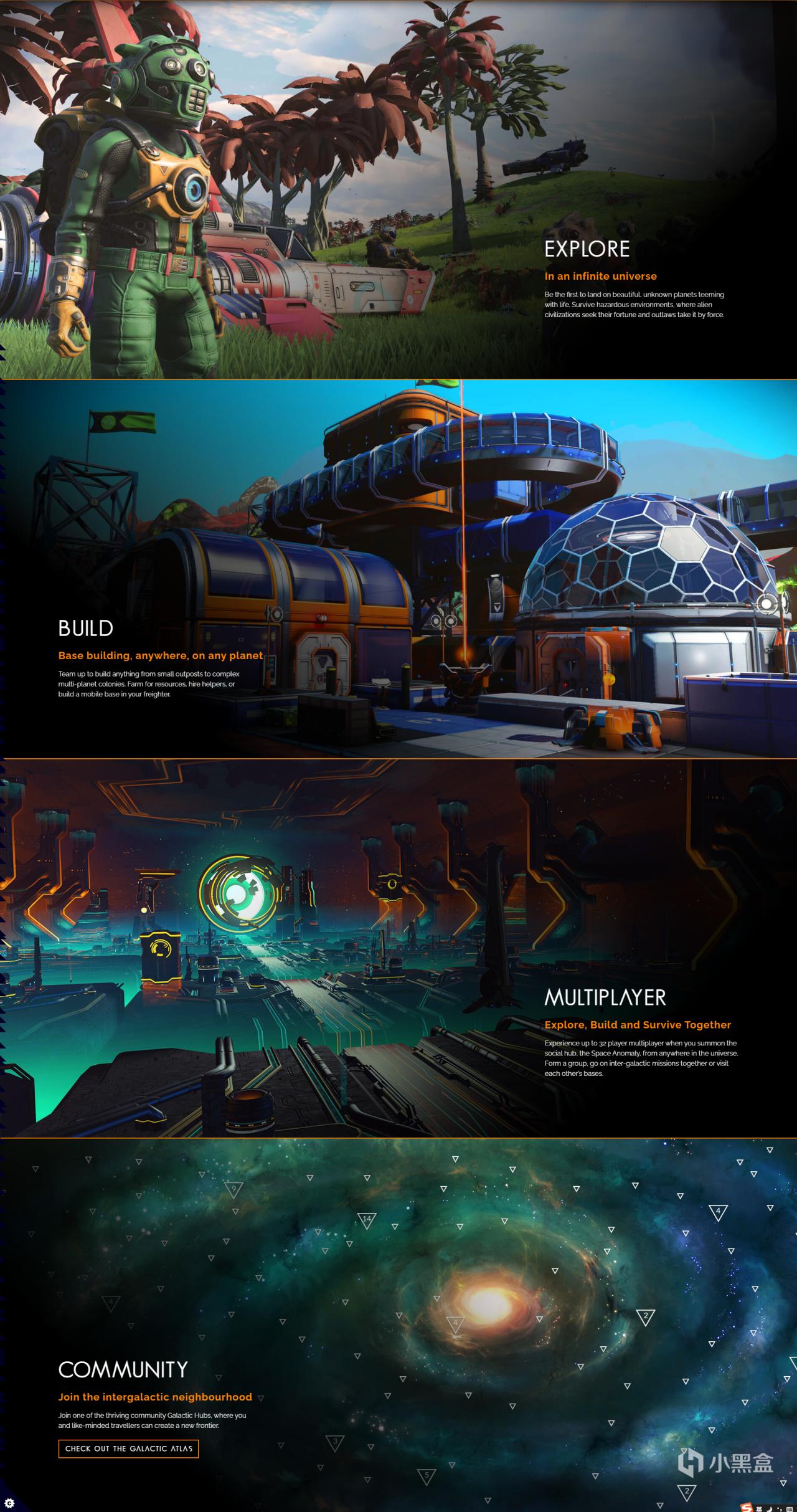 當我們打開無人深空官網的時候,可以看到官方簡單介紹了遊戲特色——探索、建造、多人、社區。