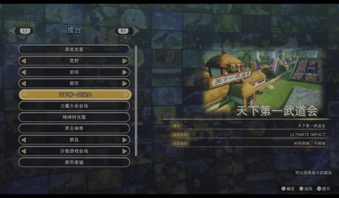 選好角色後,接着是選擇戰鬥環境,也就是戰場,但其實在一般編輯模式裏甚至還可以對戰鬥的規則進行一定程度的調整,包括時間限制,有沒有出界判定和是否禁止變身等等。